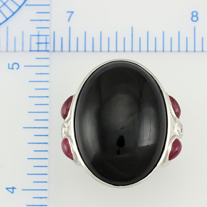 • 18K White Gold Black Nephrite Jade, Ruby, and Diamond Fashion Ring UPC #303508