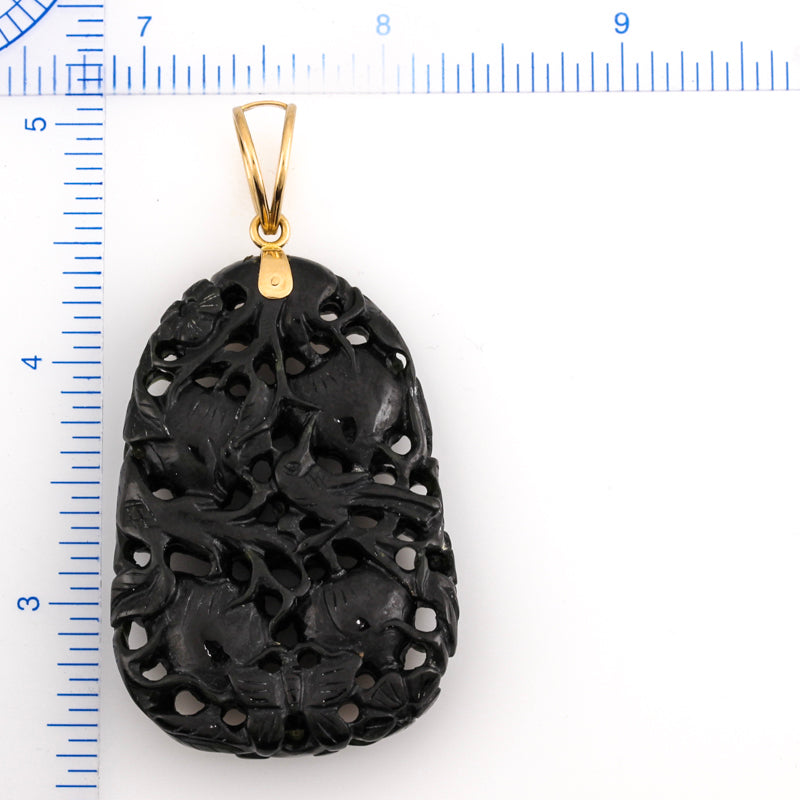 Vintage carved black nephrite jade with gourds, birds, floral & butterfly on a 14K yellow gold bail. Amazing size and design. Perfect for everyday wear & for anyone. Great jewelry gift idea! Mason-Kay gift wrap & Certificate of Authenticity included.