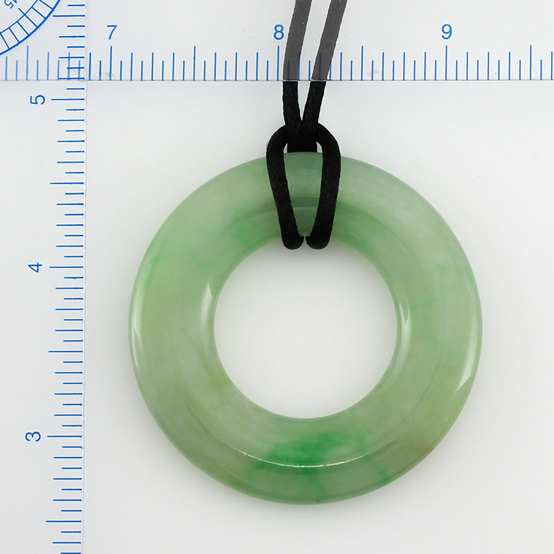 This necklace features a translucent green jadeite circle on an adjustable silky cord. Its stunning blend of green tones with subtle yellow accents and smooth texture make the perfect "worry stone" for men and women alike.