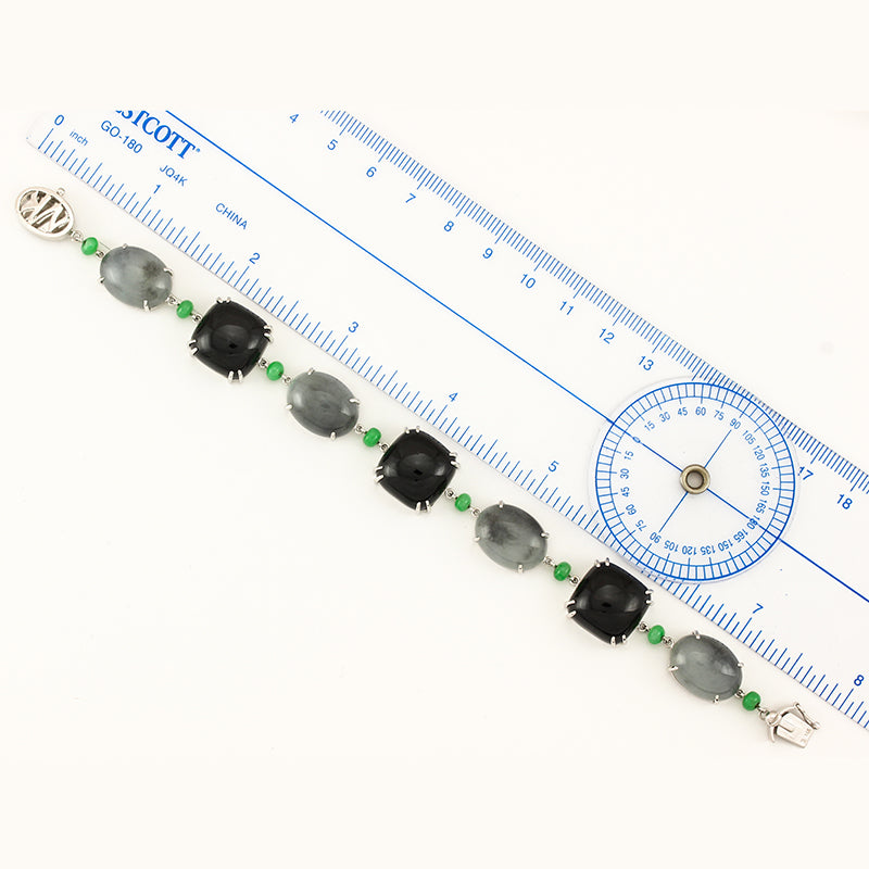 This gorgeous grey jadeite & black nephrite jade link bracelet is an eye-catching piece. Spiced up with green jade beads and 14K white gold spacers, then finished with a signature MK clasp. This bracelet measures 7.5 inches.