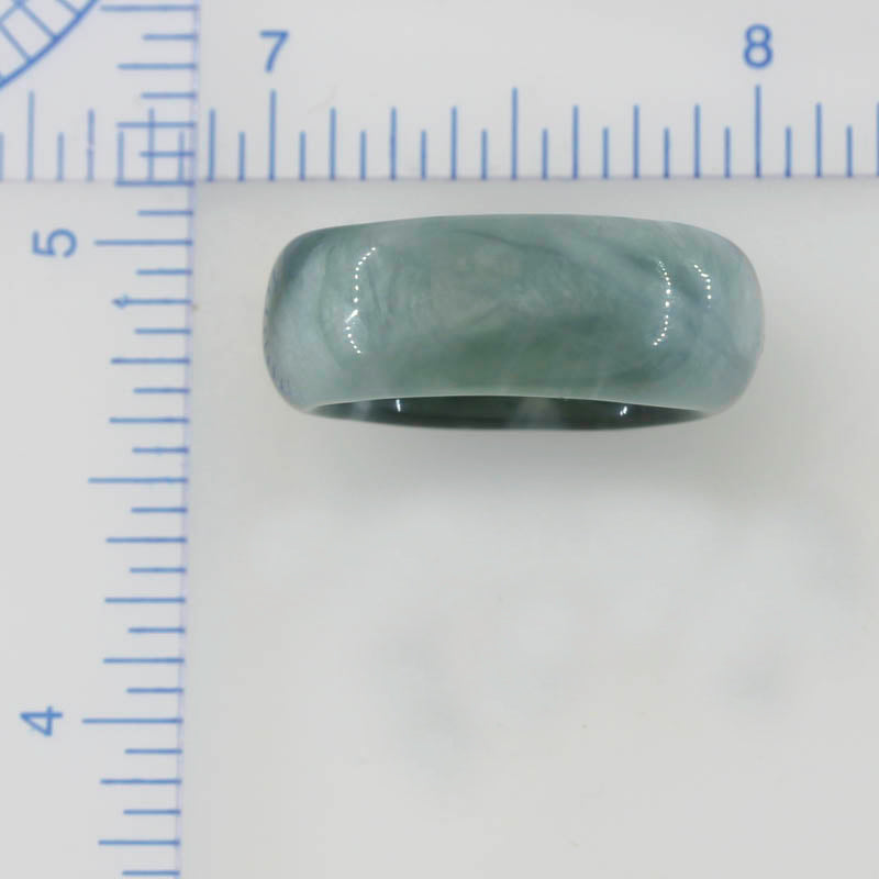 Guatemalan blue-green translucent jadeite jade solid band for men or women. Due to the stone's translucency, it's appearance may shift depending on lighting conditions. Highly translucent jade rings are tougher (more resistant to breaking) but should still be handled with care. Do not drop on cement or tile.
