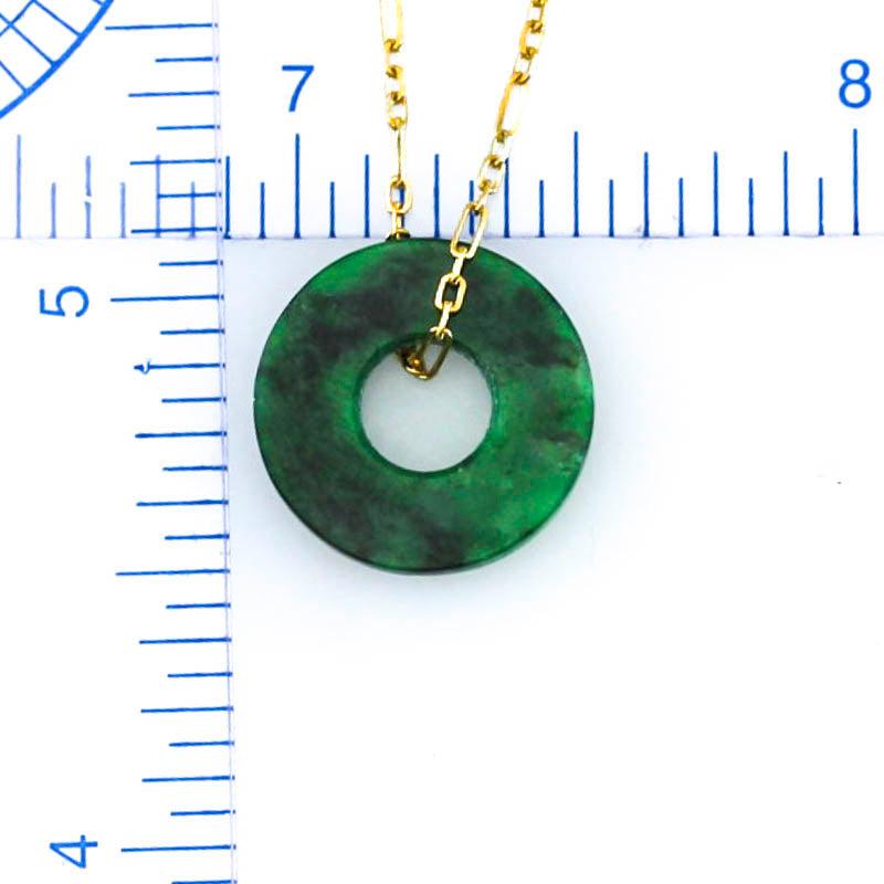 This stunning circle pendant features deep green jadeite jade accented with touches of black, beautifully set on an 18-inch 14K yellow gold chain for a striking and elegant look.