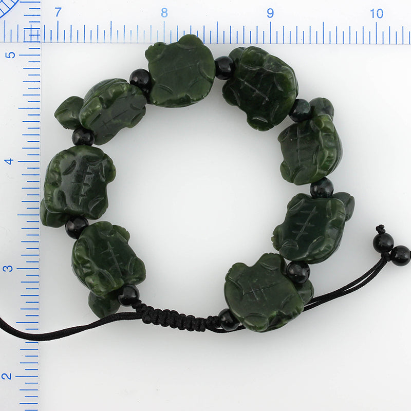This green nephrite jade carved turtle bracelet is set on a black silky adjustable pull cord. The turtle symbolizes strength & longevity. Sizes and colors of the carvings may vary slightly. A great addition to any jewelry collection! Greart Jade Gift