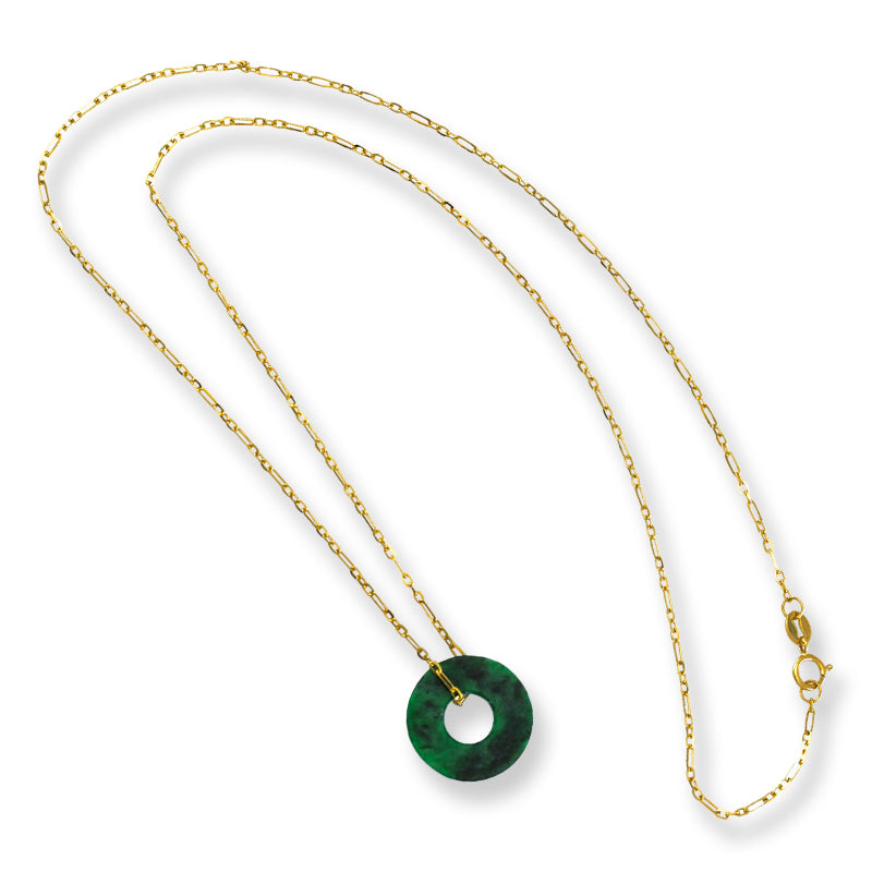 Green Jadeite Jade Flat Circle Necklace on 14K Yellow Gold Chain | UPC #399617