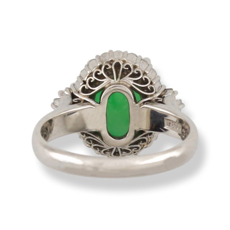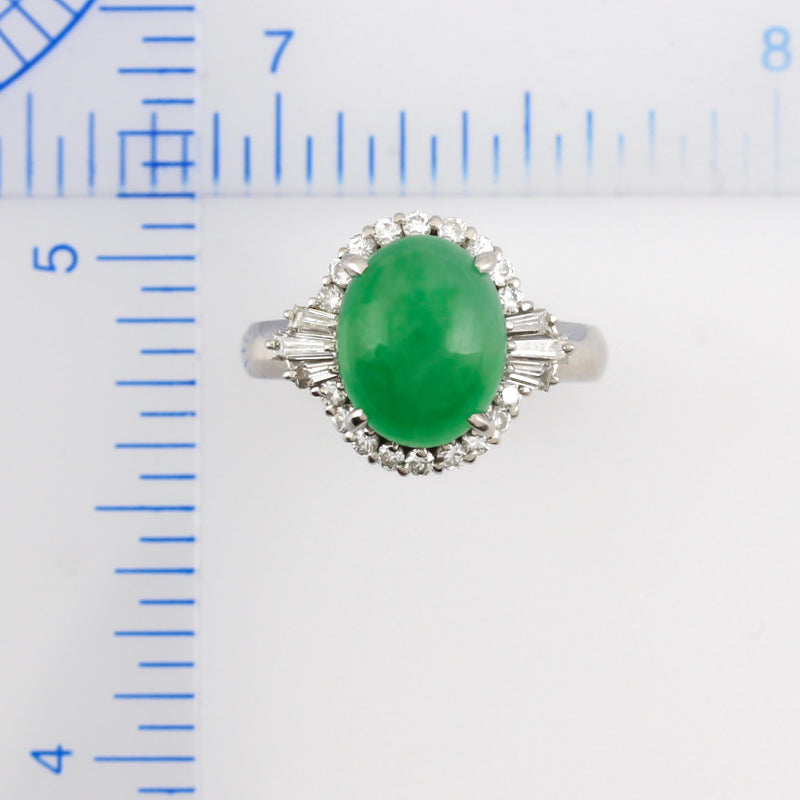 Glowing, bright apple green oval jadeite jade cabochon center surrounded by natural round and baguette diamonds. This stunning jadeite jade ring would make a perfect jade engagement ring. This authentic jade ring for women is pre-loved and a part of our Estate Jade Collection. Shop natural jade rings from Mason-Kay Jade for your jade jewelry collection.