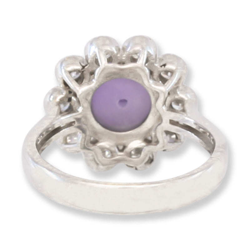This exquisite women's ring showcases a vibrant round lavender jadeite jade centerpiece, encircled by ten flawlessly matched white round diamonds, all crafted in an 18K millgrain white gold setting. Discover the elegance of natural jade rings at Mason-Kay Jade and elevate your jade jewelry collection today.