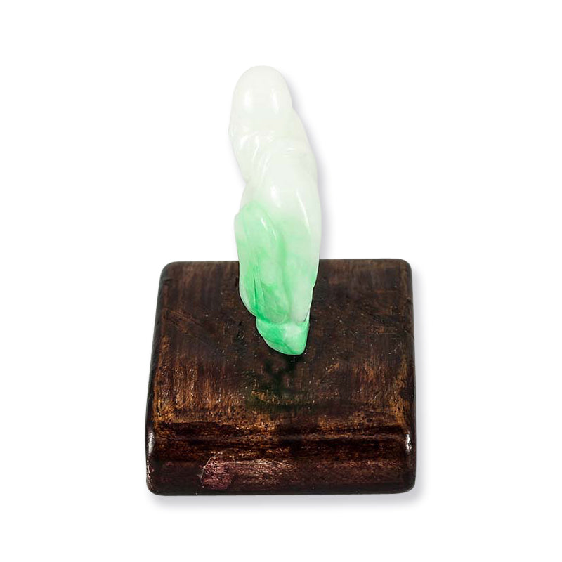 This green jade Buddha statue is a work of art. The light green jade is accented with bright apple green, creating a stunning contrast. The Buddha is depicted sitting on a wooden stand, adding elegance. Natural untreated A jade.