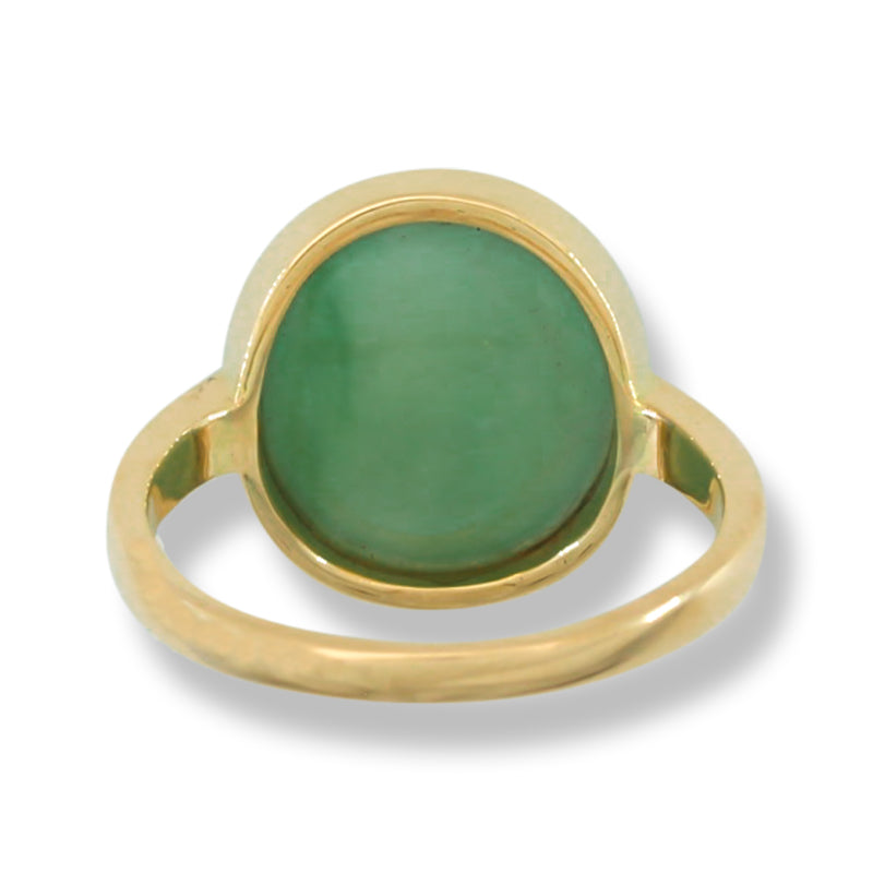 Gorgeous! One-of-a-kind green jadeite jade oval cabochon ring with a milgrain bezel mounting. Stunning color in a classic setting ring.