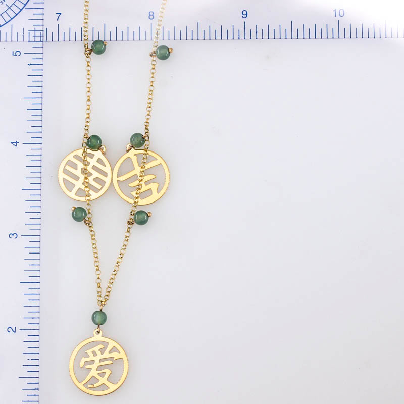 Part of our Designer Jade Collection, this jadeite jade necklace features blue green jadeite jade beads on a 14K yellow gold chain and charms with the Chinese characters for Luck, Happiness, and Love.