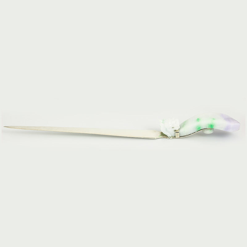 This letter opener features a hand-carved dragon design and has a unique moss-in-snow color with hints of lavender. The blade is made from sterling silver with a polished finish. A great piece to adorn any desk.