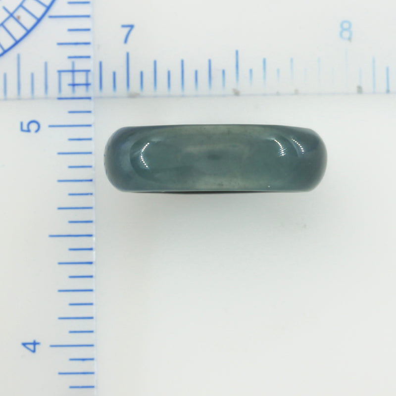 Dark blue-green jadeite jade solid band for men and women. Due to the stone's translucency, it's appearance may shift depending on lighting conditions. Highly translucent jade rings are tougher (more resistant to breaking) but should still be handled with care. Do not drop on cement or tile.
