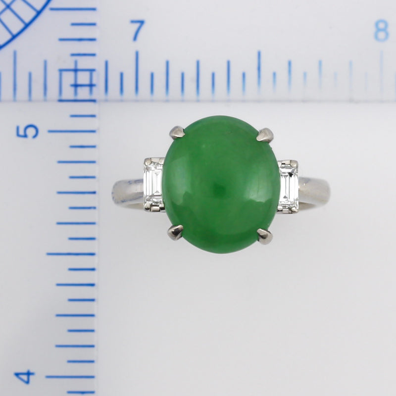 Translucent, Bright, Apple Green Jadeite Jade oval cabochon set in an exquisite platinum ring mounting with baguette diamond side stones. Finger size 8.5. So Beautiful as a gift, engagement ring, anniversary ring, or just I Love You Gift!