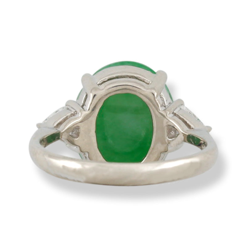 This apple green jadeite jade ring for women has a classic look with a touch of flare. Green jadeite jade oval cabochon center is prong set with two trilliant cut side stones in platinum. Perfect alternative to a diamond solitaire engagement ring. Shop natural jade rings from Mason-Kay Jade for your jade jewelry collection.