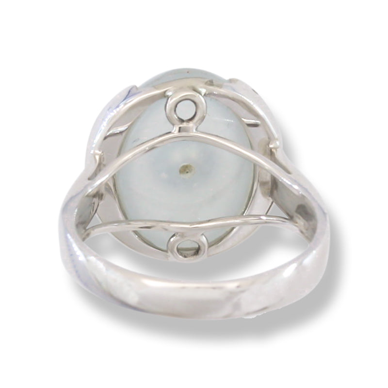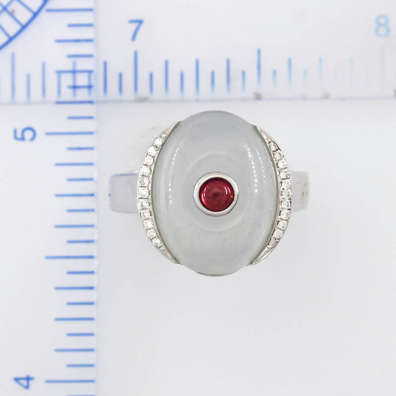 Stunning ice jadeite jade oval cabochon set in an 18K white gold mounting, accented with pavé diamond side stones. In the center, a round genuine ruby gemstone is set in an 18K white gold bezel.
