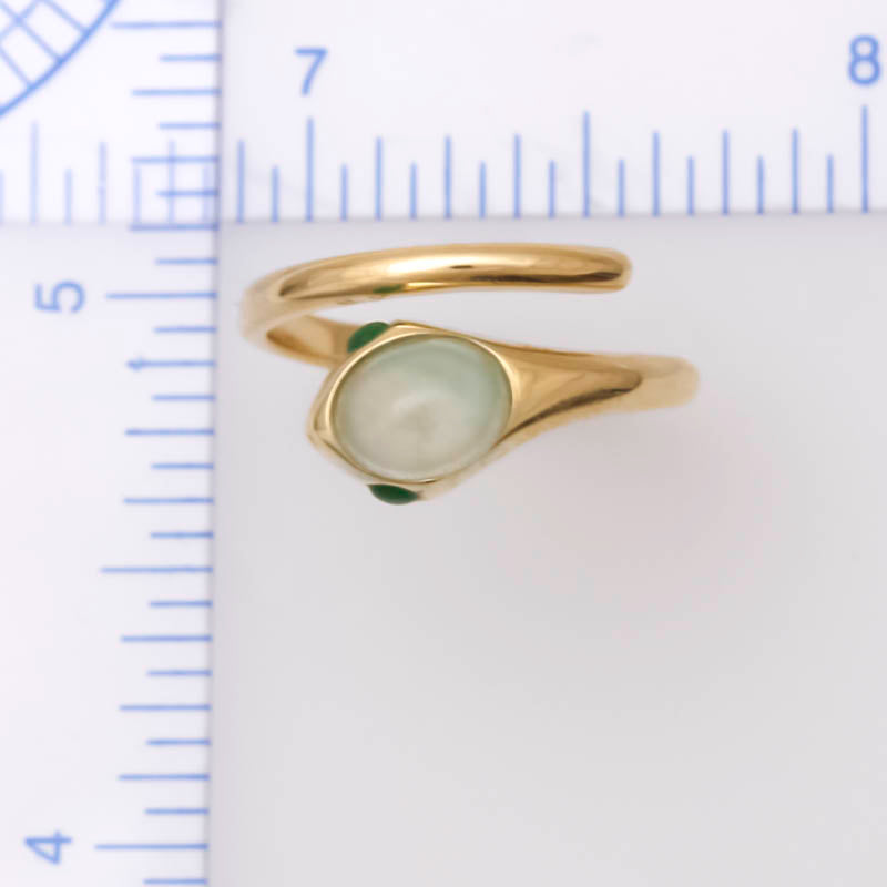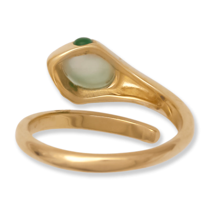 Ice jadeite jade snake head with green jade eyes in a 14K yellow gold bypass ring.