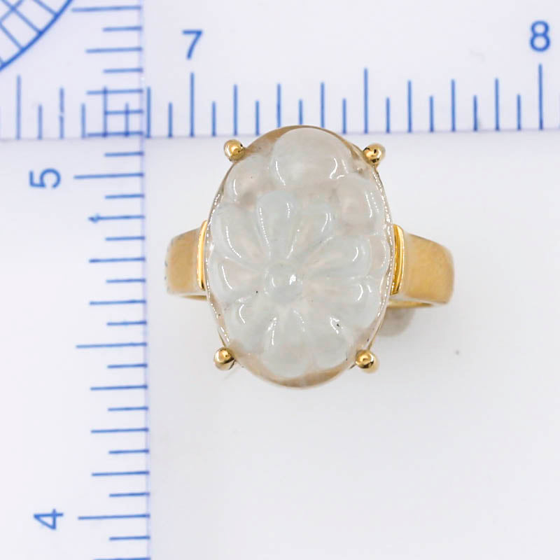 This exquisite icy jadeite jade ring for women features a timeless oval floral carved cabochon set in an 18K yellow gold 4-prong setting. Its elegant design makes it perfect for everyday elegance and lasting style.