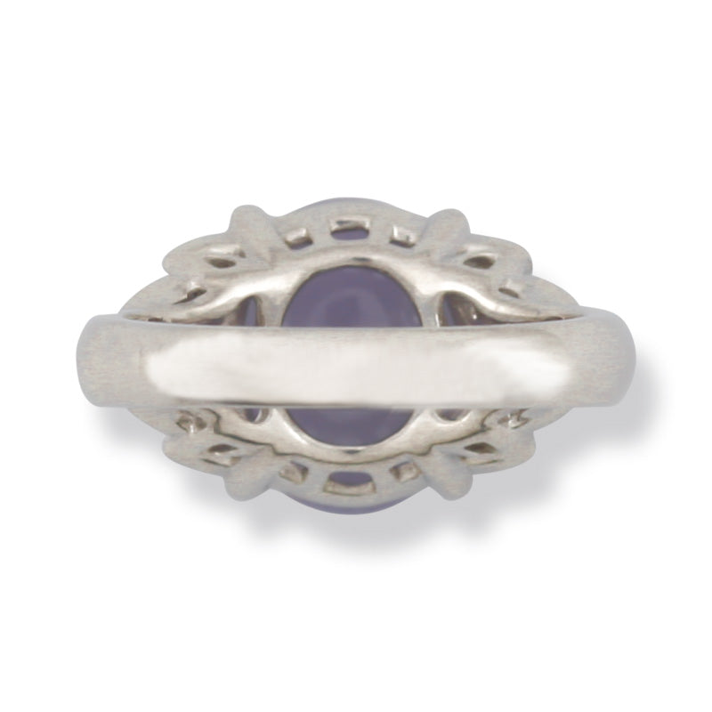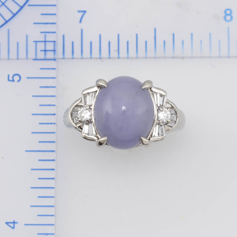 Amazing Jade Gift! Give this natural lavender jadeite oval cabochon ring with fancy diamond mounting! What a gorgoeus estate mounting! This even lavdender stone is set in platinum with .37cts of fancy diamonds! Finger size 5.75