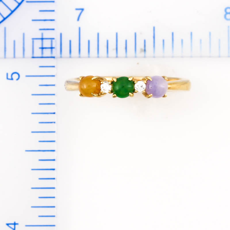 This small, but powerful band ring is just what any jade lover needs. Yellow, green, and lavender oval stones are set in a 14K yellow gold mounting with .05ct. tw. diamond accents. Finger size 7. All Mason-Kay jade jewelry is genuine A Jade.