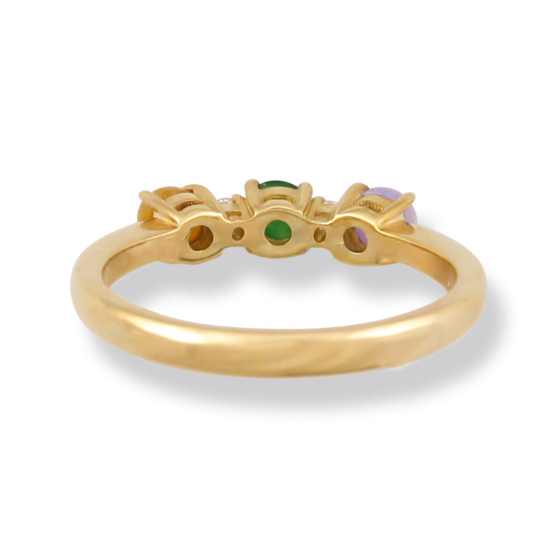 This small, but powerful band ring is just what any jade lover needs. Yellow, green, and lavender oval stones are set in a 14K yellow gold mounting with .05ct. tw. diamond accents. Finger size 7. All Mason-Kay jade jewelry is genuine A Jade.