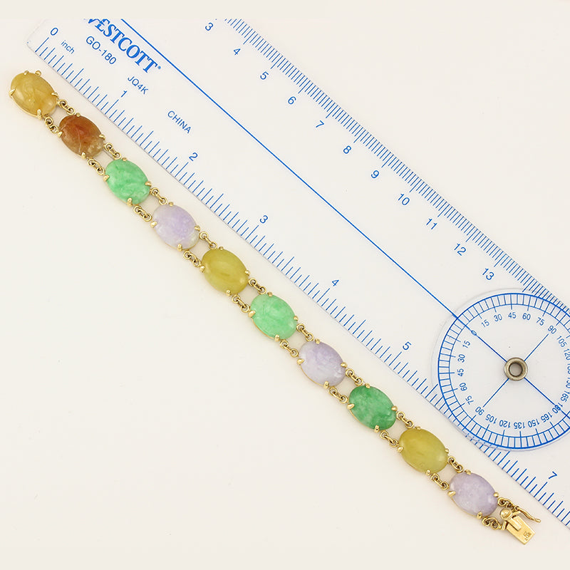 This beautiful multicolor jade oval cabochon bracelet for women is set in 14K yellow gold, and measures 7.5 inches long. Jade colors include yellow jade, red jade, green jade, and lavender jade. Shop natural jade bracelets from Mason-Kay Jade for your jade jewelry collection.