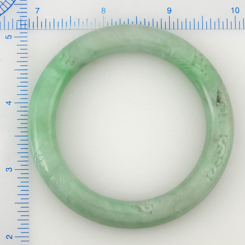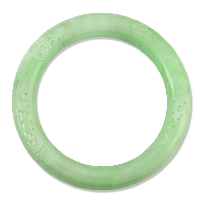 This natural jade bangle bracelet has natural green jade color. Our jadeite jade is natural, meaning it has NO dyes and NO polymer-impregnation. Some of our pieces may have a thin coating of beeswax to protect the surface of the jade. This does not affect the appearance or value of the stone.