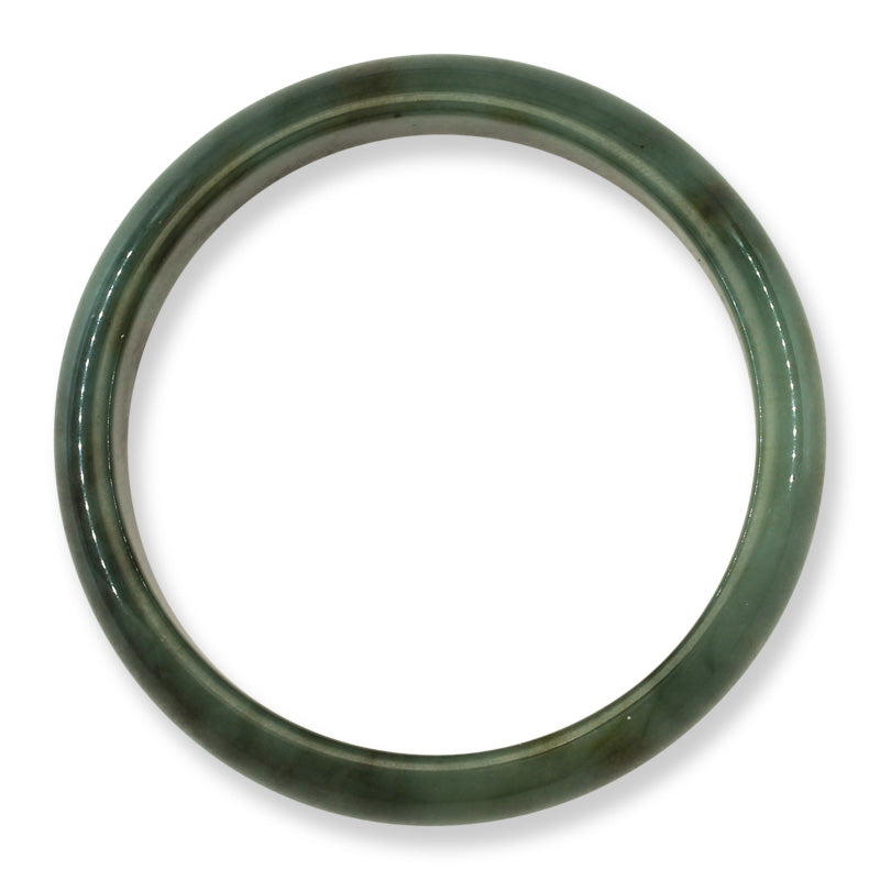 Moody and mysterious, this dark green jadeite jade bangle is accented by a delicate hint of red that adds depth and character.