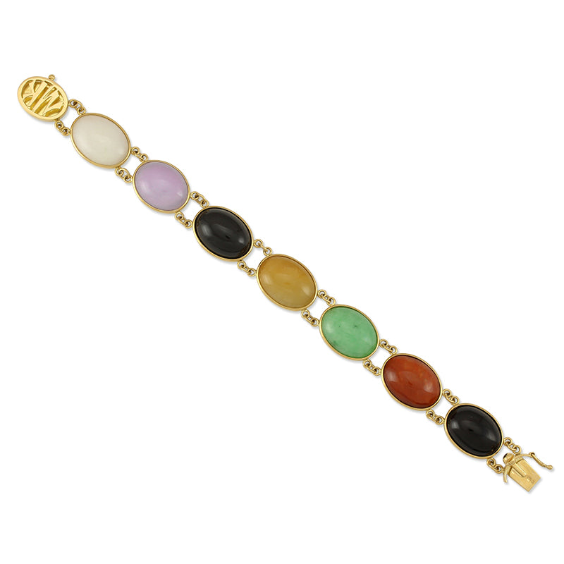 Amazing 7 vivid, bright rainbow jadeite jade bezel set cabochons with 18K yellow gold chain links & a signature MK clasp. This fine jadeite jade bracelet is 7-inches long. Perfect combination of natural color. Perfect addition to any jade jewelry collection. Mason-Kay gift wrap included.