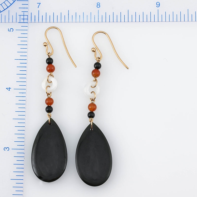 These elegant 27mm black nephrite jade tear drop earrings feature flat shapes complemented by white jadeite circles and accents of red and black jade beads, all set on 14K yellow gold shepherd hooks.