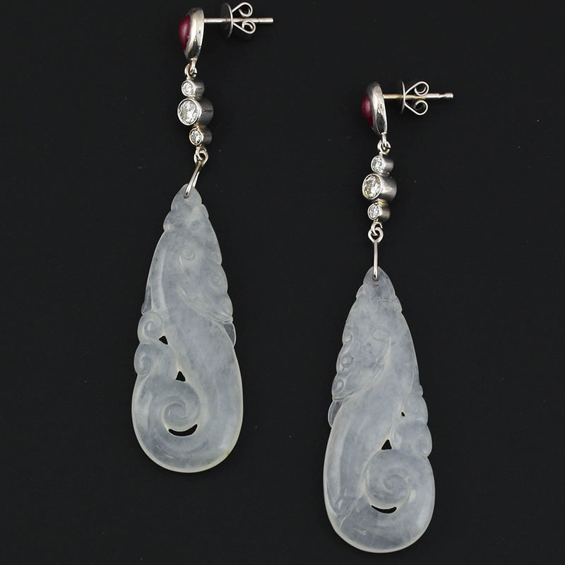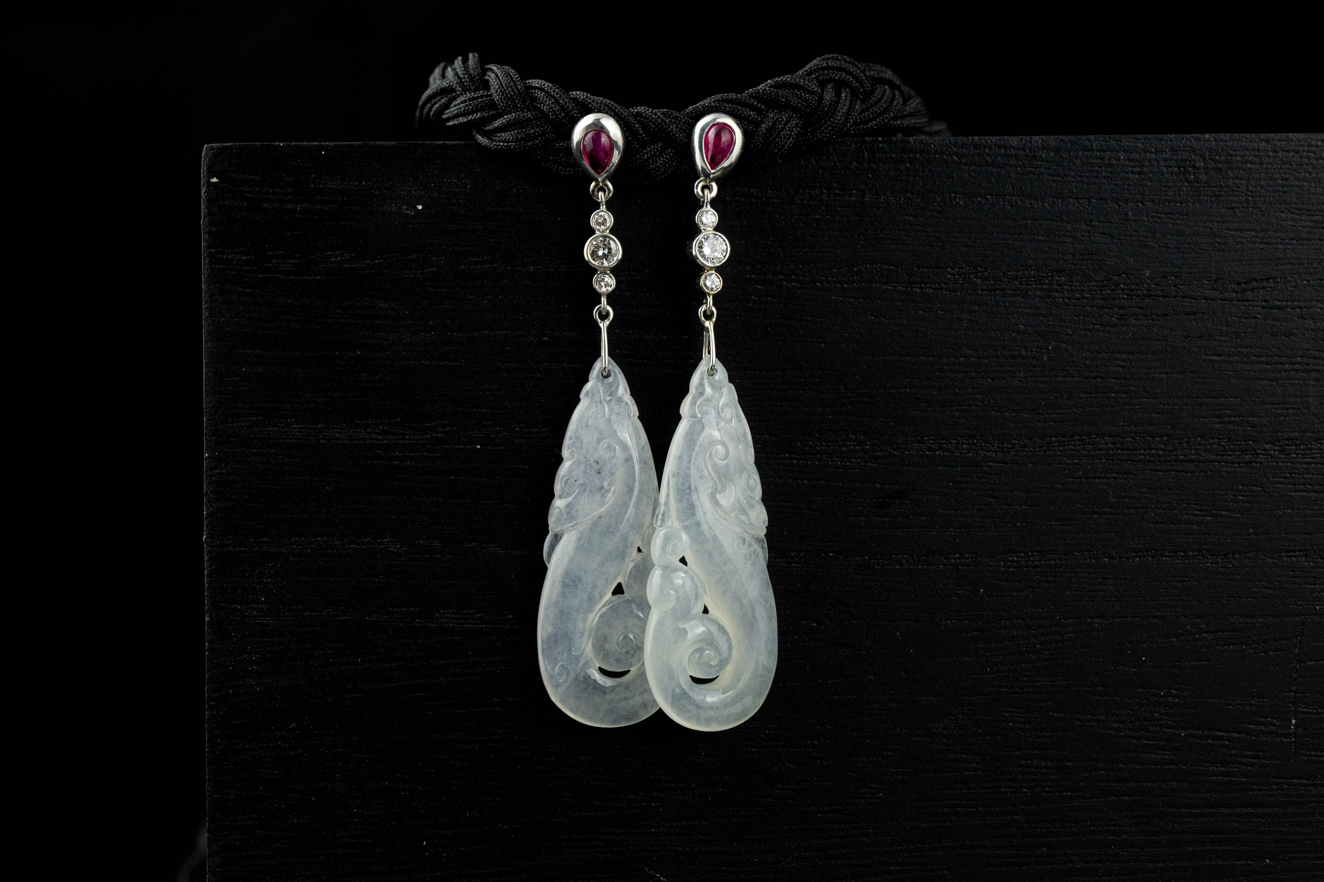 Depicted in these translucent ice jadeite jade earrings are hand-carved dragon motifs, accented by genuine ruby cabochons and natural round brilliant diamonds.