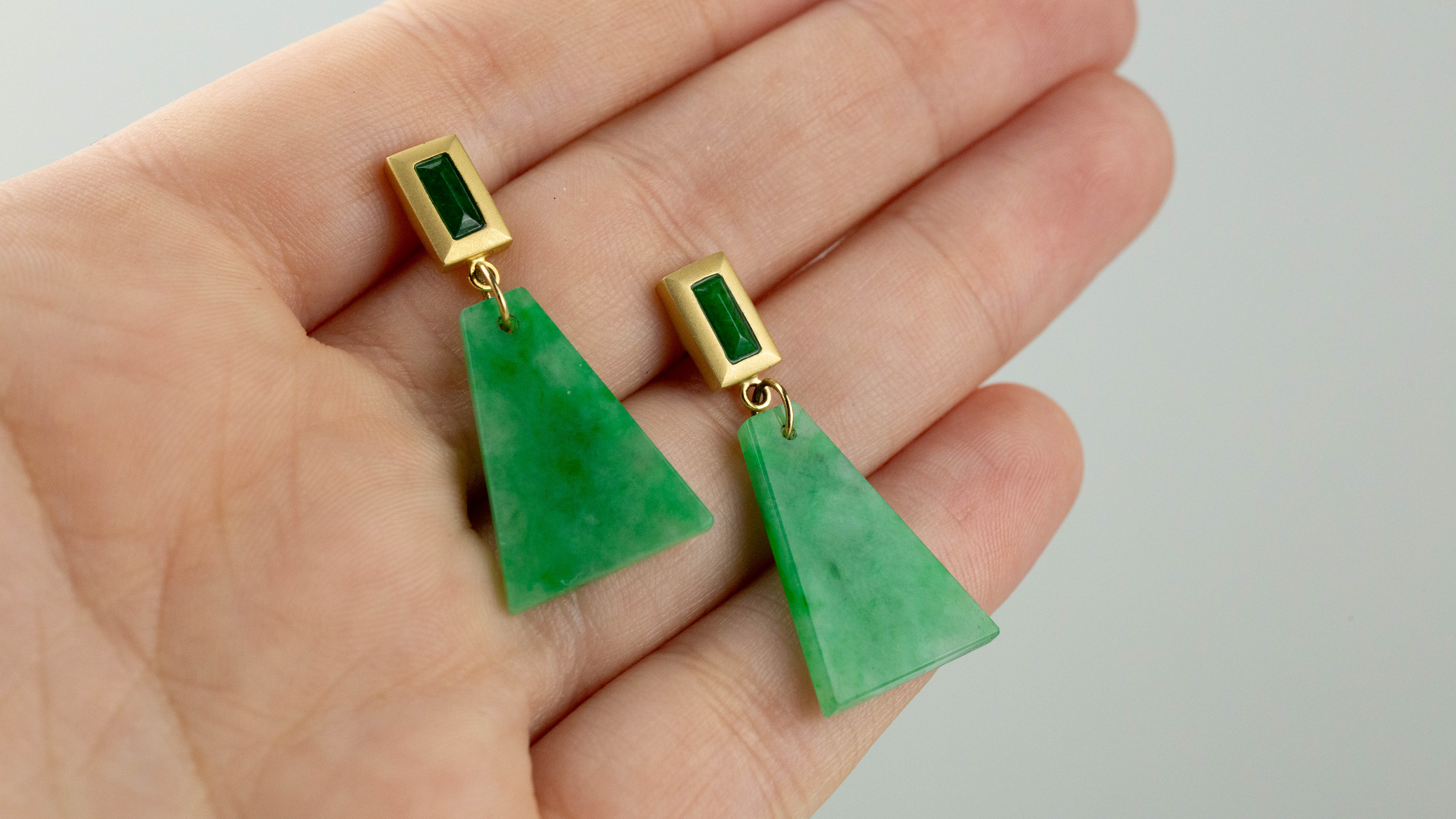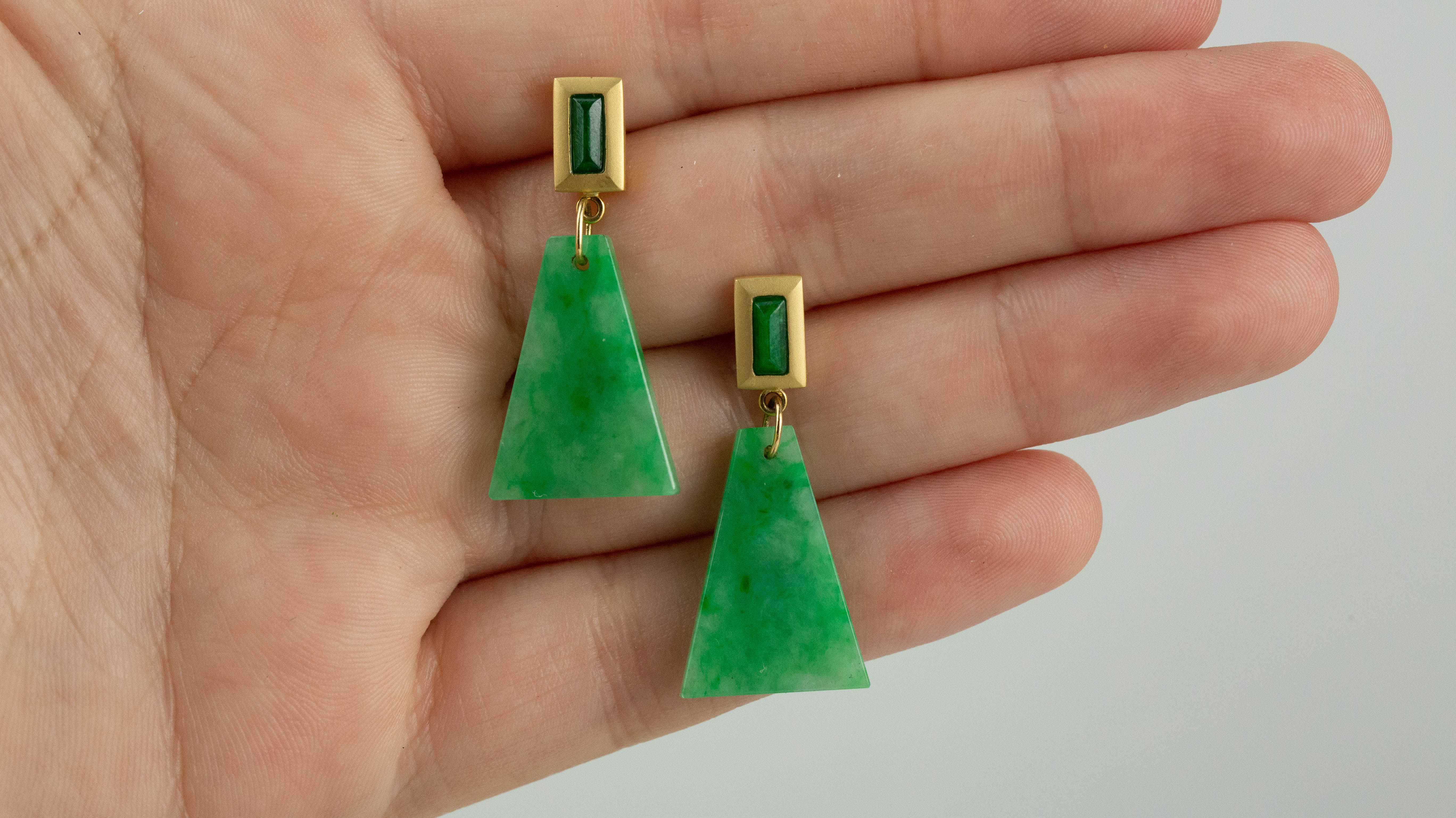 Apple green jadeite jade trapezoid earrings with green jade baguettes set in 18K yellow gold with a modern satin finish. Shop natural jade jewelry from Mason-Kay Jade for your jade jewelry collection.