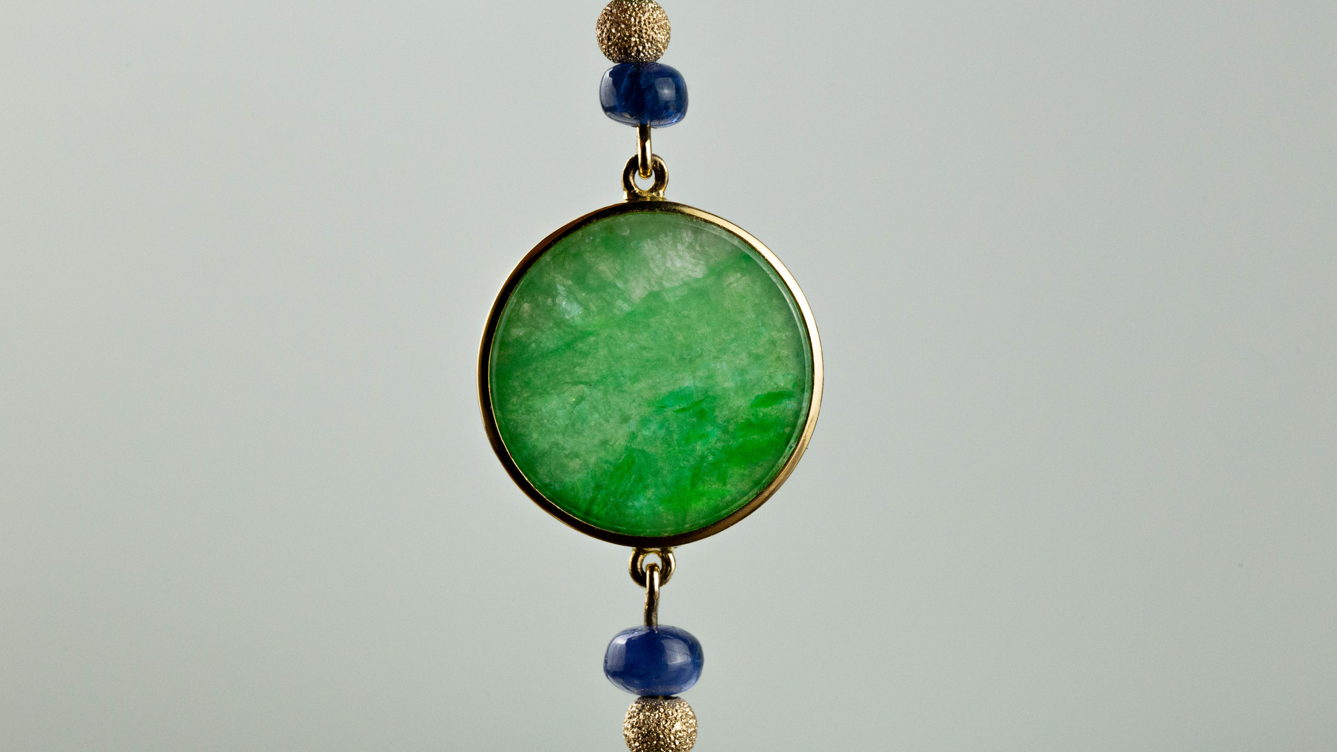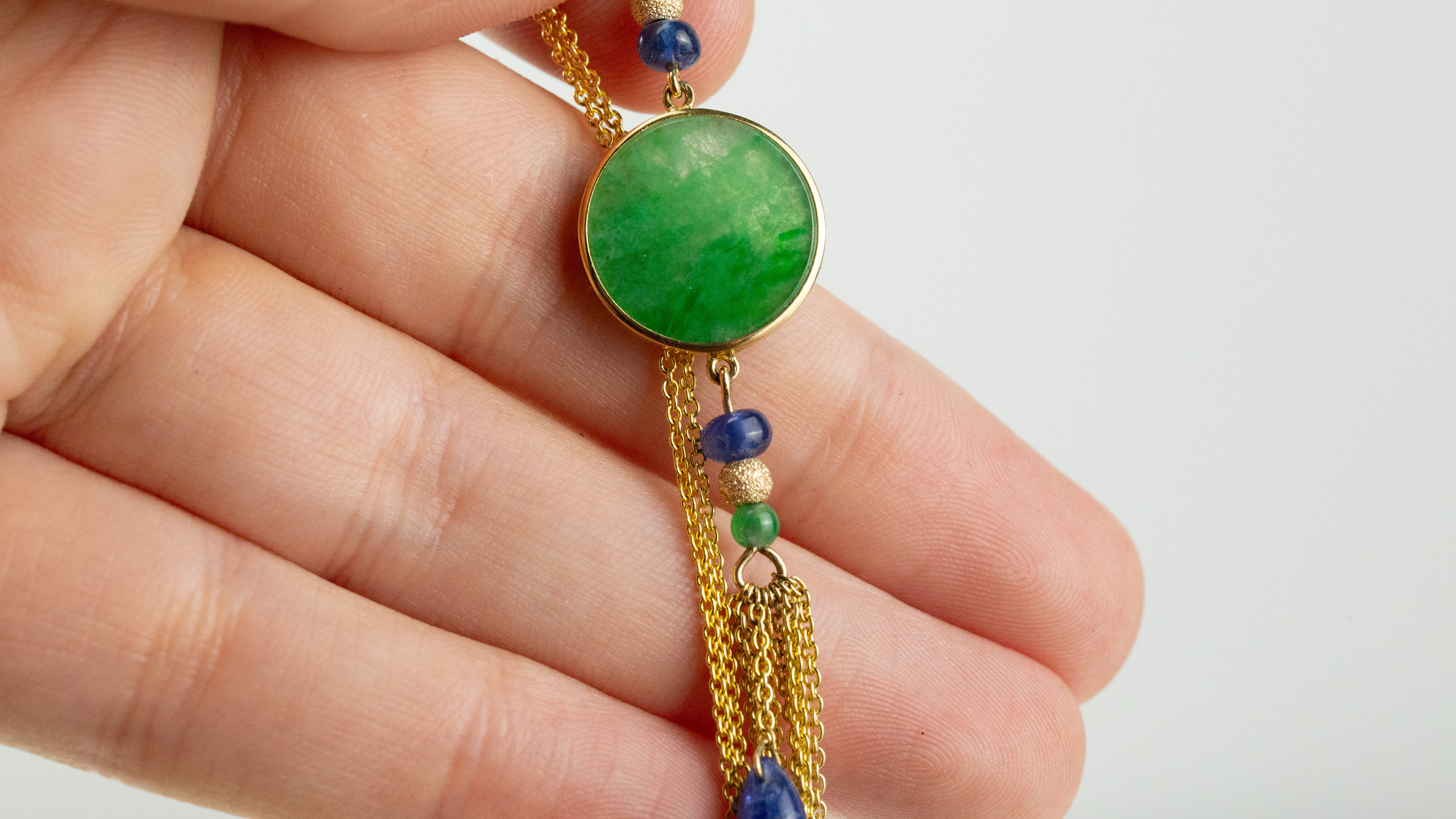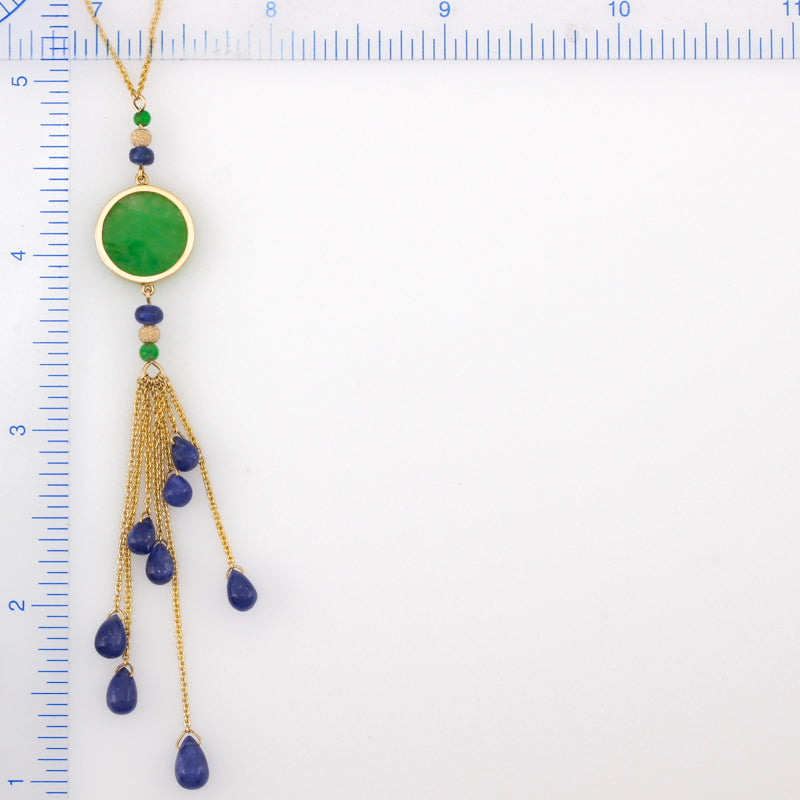 Our Designer LOVES Tassels! Mason-Kay Designer necklace featuring a flat green jadeite round tablet centerpiece bezel set 14K yellow gold with gold stardust beads, green jadeite & blue sapphire accents. Adjustable at 20 & 18-inch.