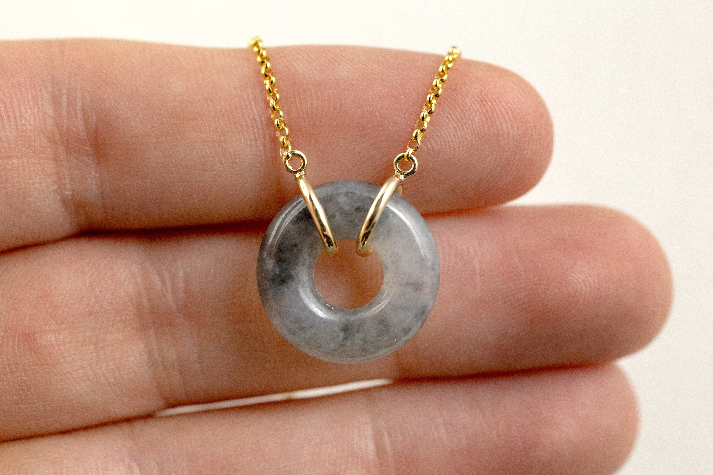 Beautiful translucent grey jadeite jade circle necklace set in 14K yellow gold on an adjustable 18 & 16-inch chain, perfect for everyday wear! Amazing Jade Gift For ANYONE! Includes Gift Wrap & Certificate of Authenticity. Color May Vary Slightly