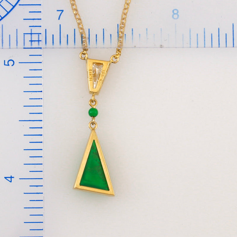Translucent green jade stone set in an 18K yellow gold frame with a .28cttw. baguette diamond top on an adjustable 18-20" cable chain. Shop natural jade jewelry from Mason-Kay Jade for your jade jewelry collection.