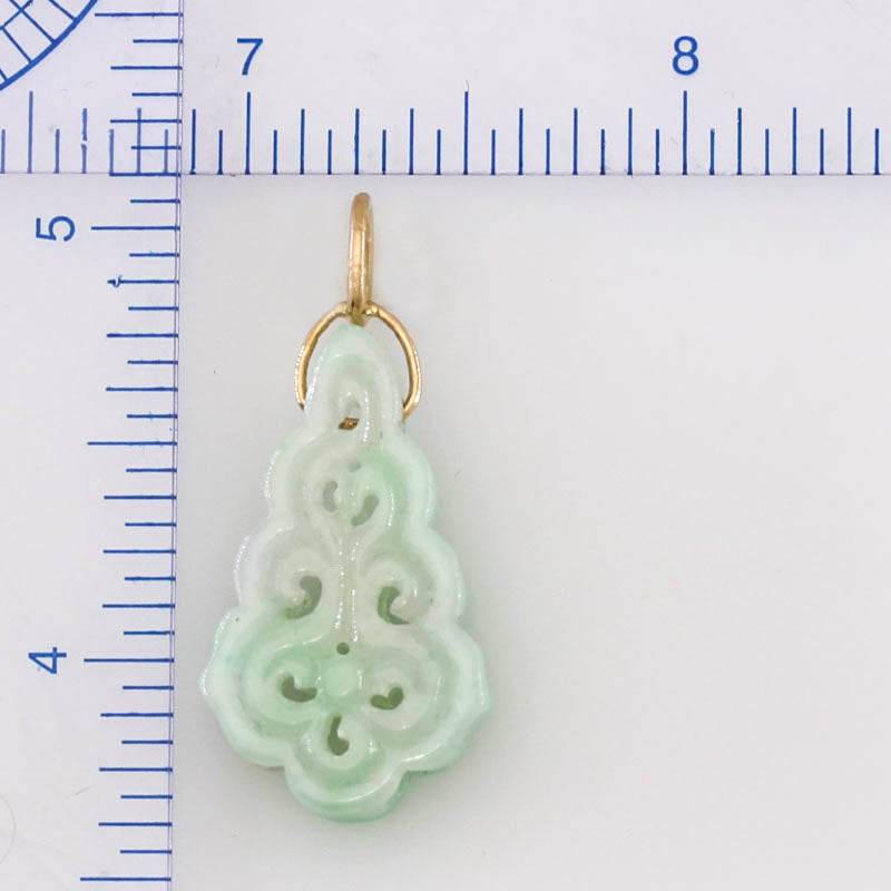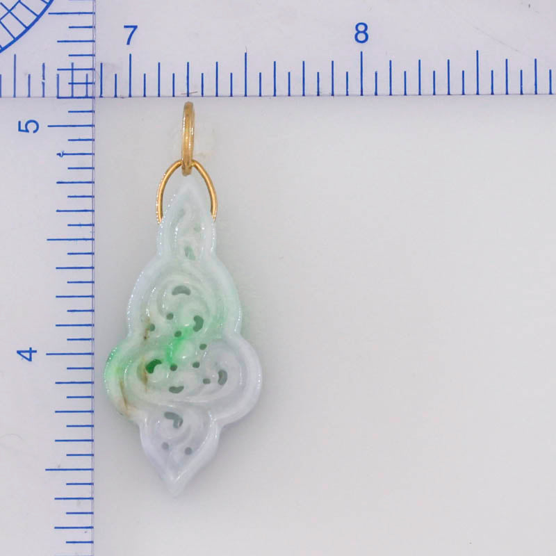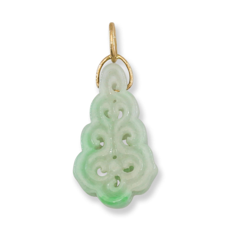 This green jadeite jade pendants are adorned with finely carved scroll work and finished with a yellow gold oval loop bail. Its soothing green color and exquisite craftsmanship make it an essential piece. Designed to be reversible and versatile, it’s perfect for daily wear and a meaningful jade gift for any celebration.