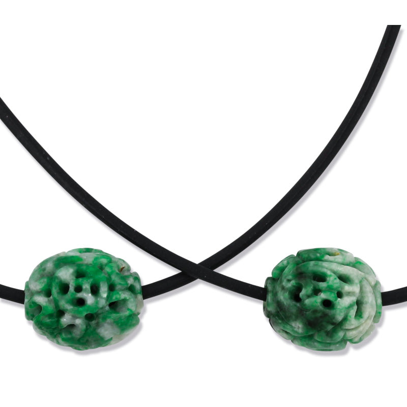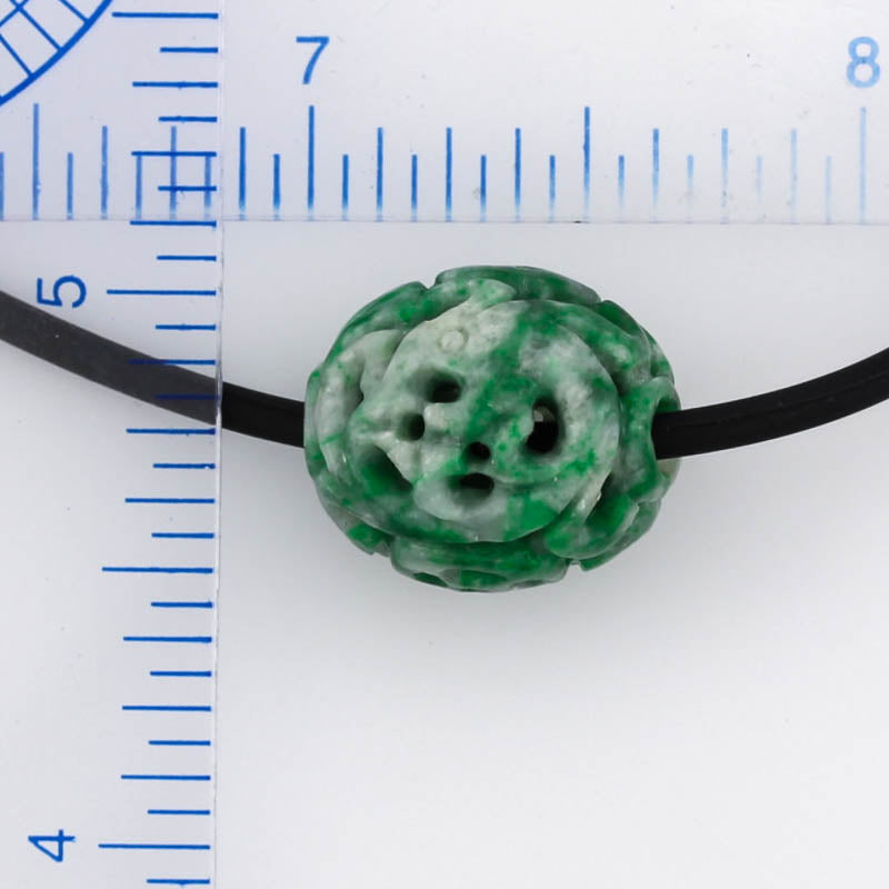 Carved green jadeite jade oval bead on an 18-inch rubber cord with dragon, phoenix and coin motifs. Please Note: As jade is a natural material, each piece is truly unique. This means that the size, shape and color of the stone you receive may differ slightly from the photographs.