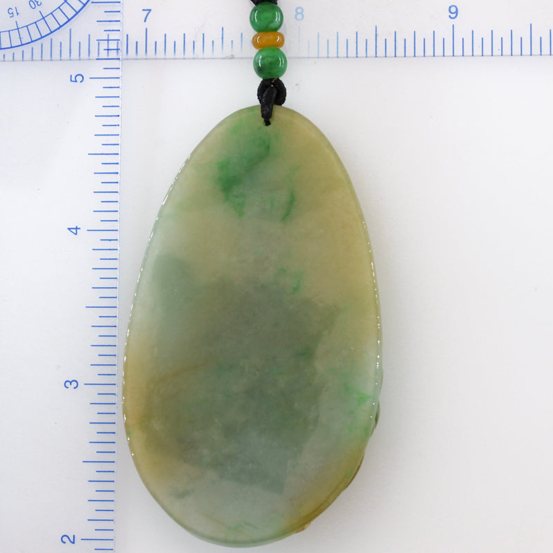 This guanyin carving for women has natural green and yellow jadeite jade color and comes on an adjustable cord.