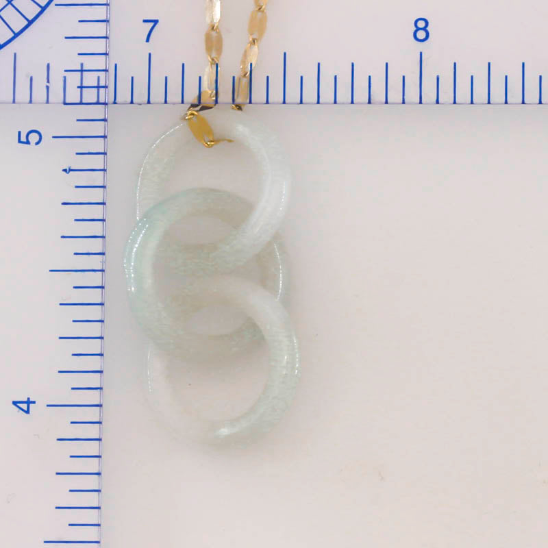 This necklace features three interlocking white jadeite jade rings suspended from a 14k yellow gold chain. Remarkably, all three rings were carved from a single piece of jade, showcasing exceptional craftsmanship and elegant design.