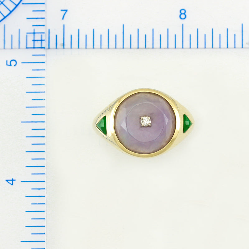 Unusually cut round lavender jadeite jade disc with two bright green jadeite triangular side stones set in a 14K yellow gold ring with diamond center. Finger size 7. Certified Natural Type A Jadeite Jade. Includes Certificate of Authenticity.