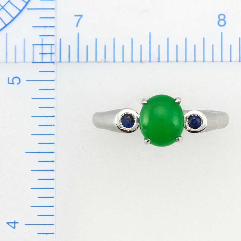 Sophisticated and timeless, this ring highlights an evenly colored, bright medium apple green jade oval cabochon prong set in luxurious 18K white gold. Accented by round, faceted sapphire side stones and finished with a satin-textured tubular shank, it’s a perfect blend of elegance and style.