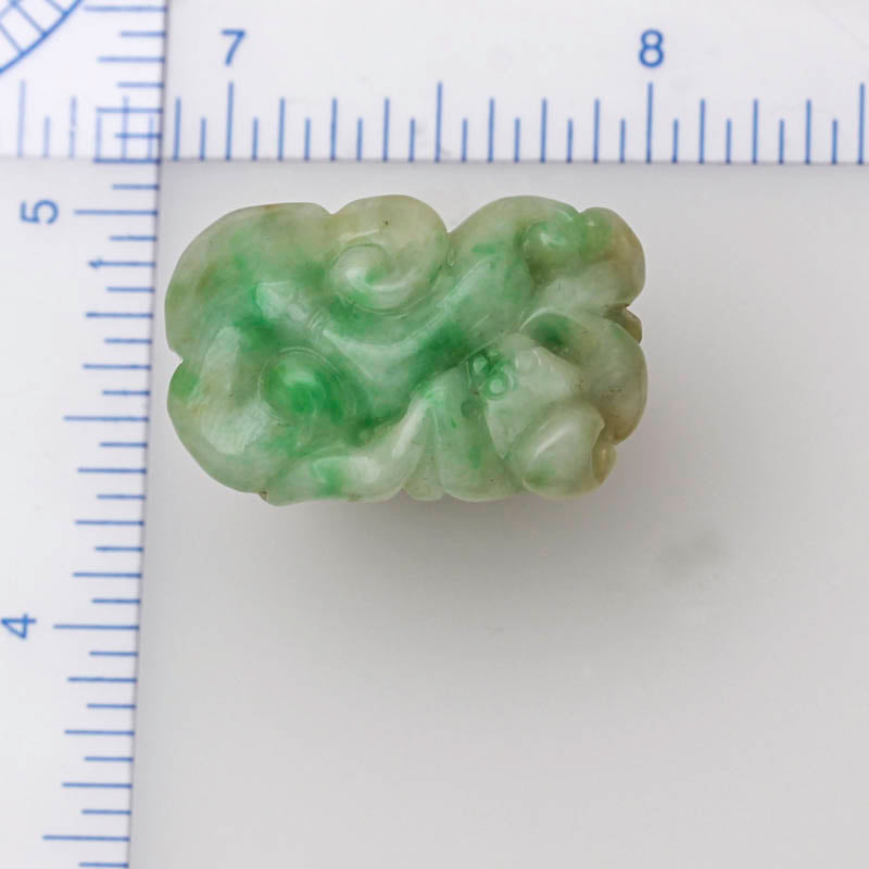 This vintage green solid jade saddle ring is carved from a single piece of natural jadeite jade. The saddle top is carved with a lingzhi and bat making this ring rare and sought after in the jade market. This ring is a one-of-a-kind piece of natural jadeite jade and can not be sized. Shop natural jade rings from Mason-Kay Jade for your jade jewelry collection.