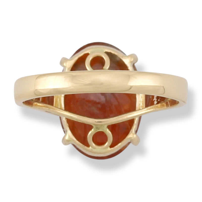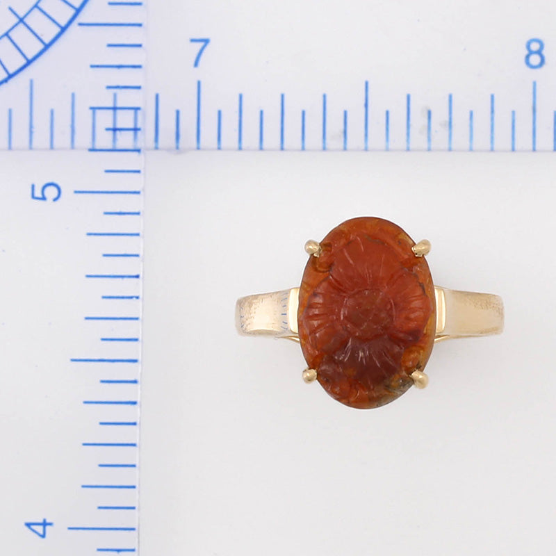 This red jade oval floral carved cabochon is prong set in a 14K yellow gold mounting. This ring would make a perfect addition to your jade jewelry collection.