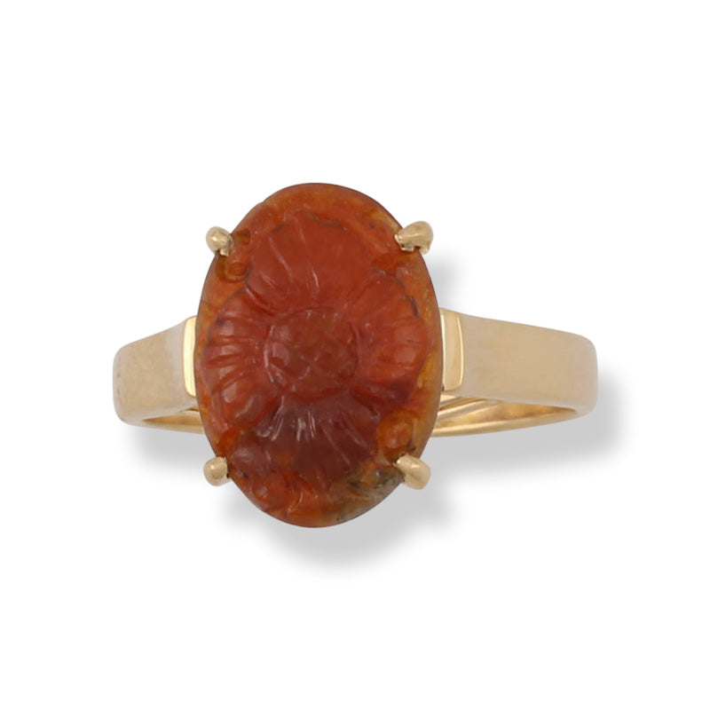 14K Yellow Gold Carved Red Jadeite Jade Floral Ring | UPC #365773