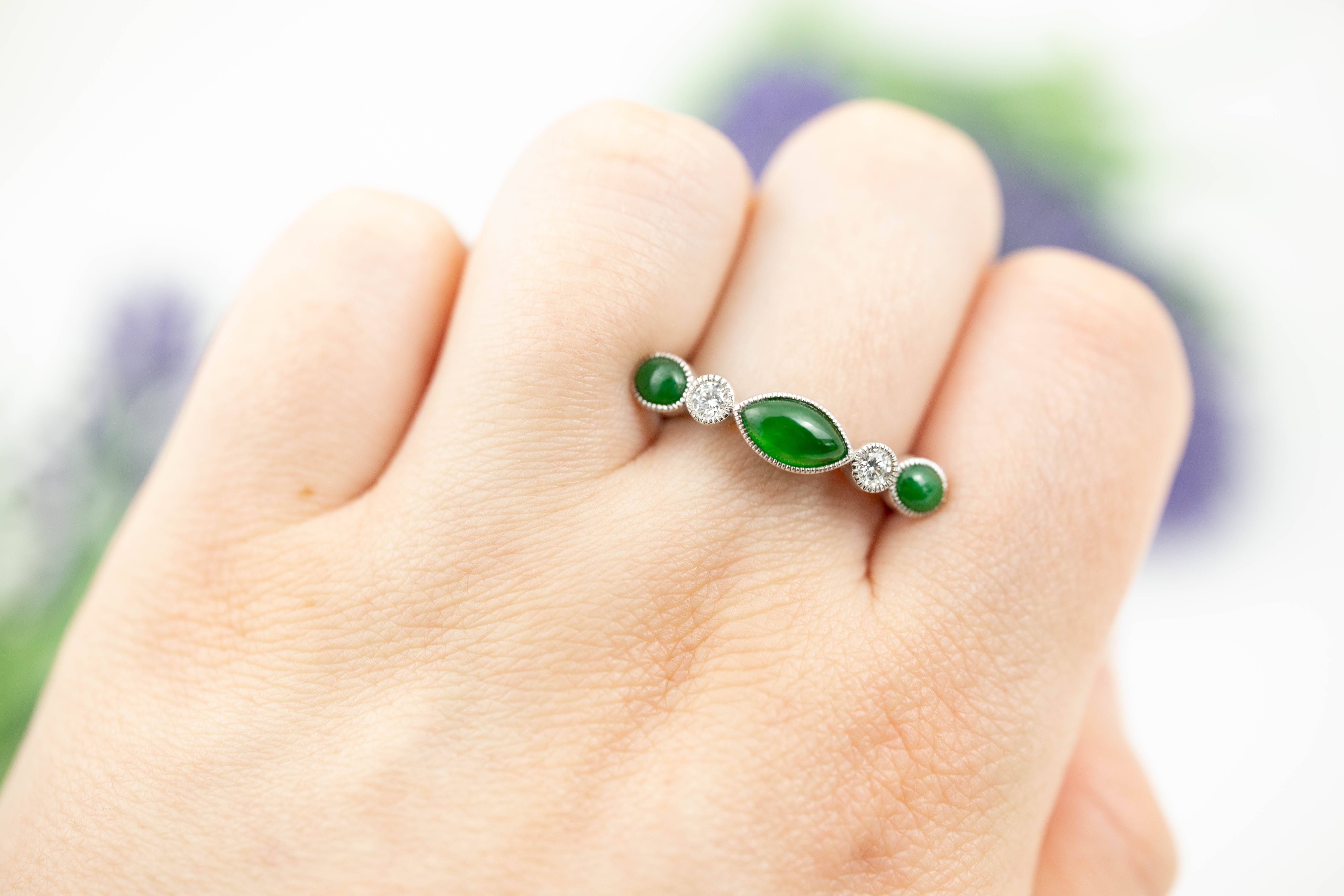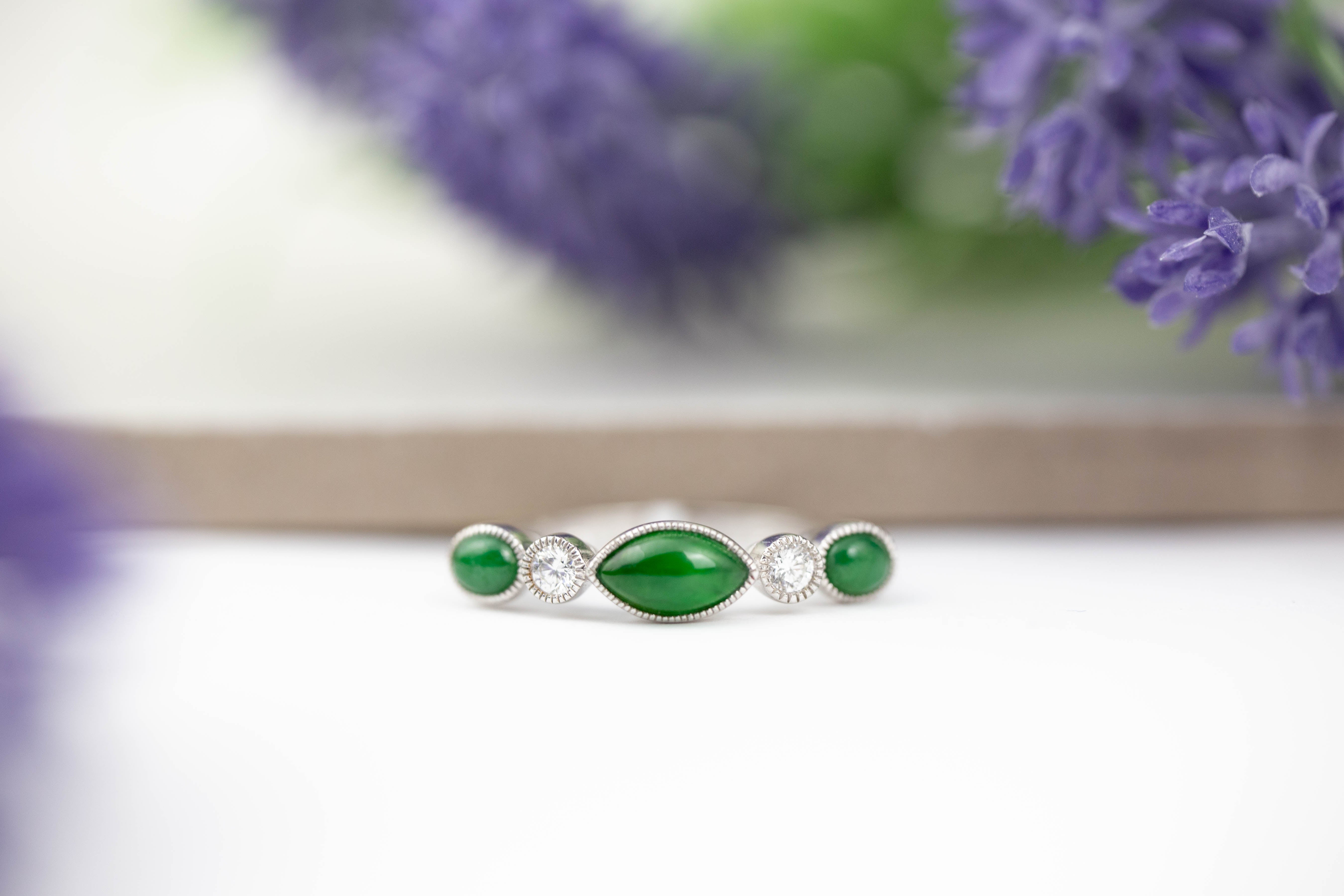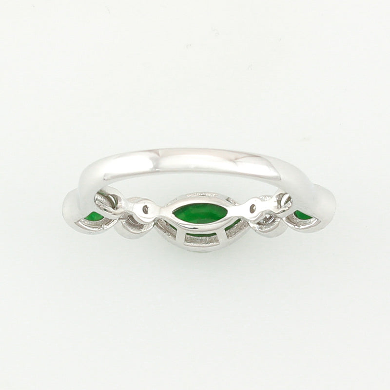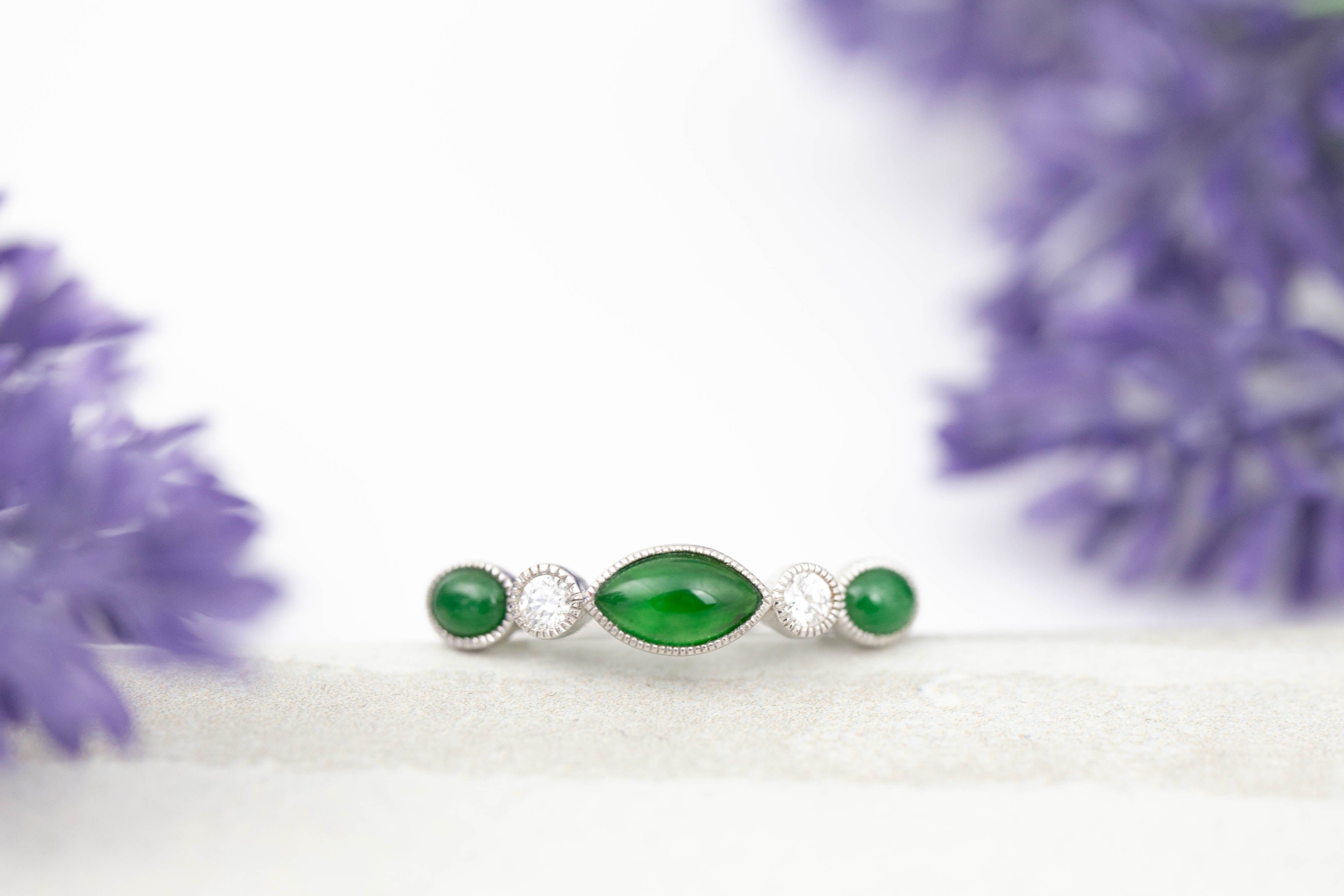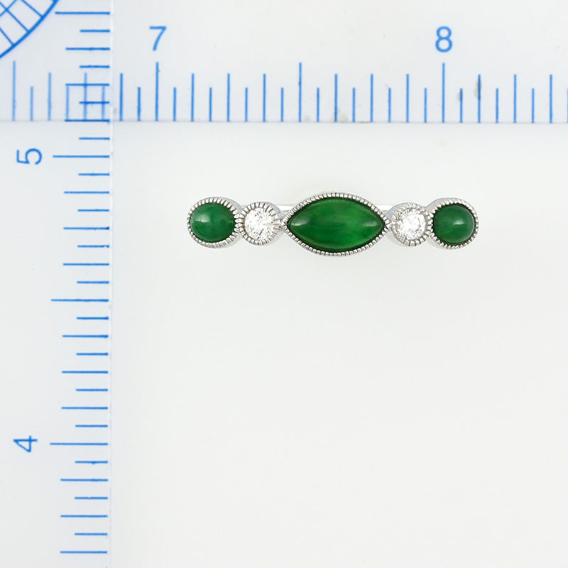 Gorgoeus designer jade band ring! Rich green jadeite jade marquise center stone & two green jadeite oval side stones set with two round diamonds in a 18K white. Finger size 7. All orders include MK Gift Wrap & Certificate of Authenticity. Get Jad