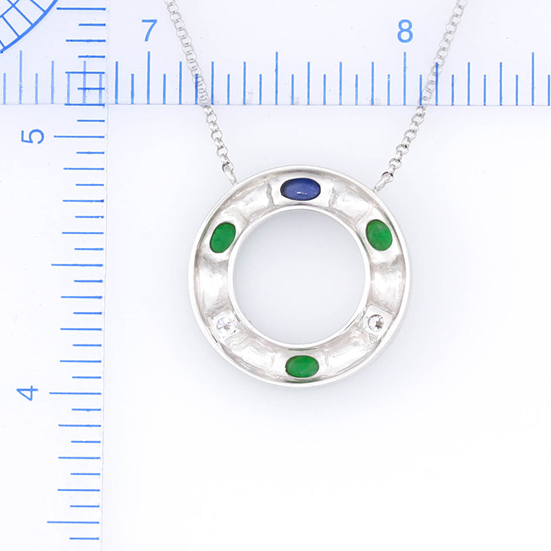Gorgeous Designer Circle Jade Necklace. Green jadeite ovals, blue sapphire cabochon oval & 2 round diamonds are featured in this 18K white satin finished circle necklace. All orders include our MK Gift Wrap & Certificate of Authenticity.