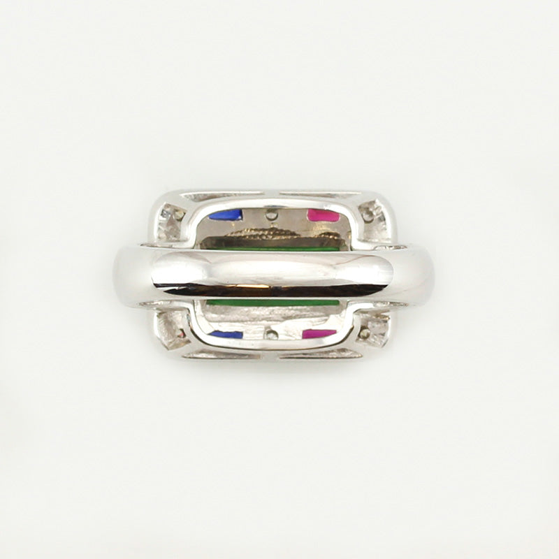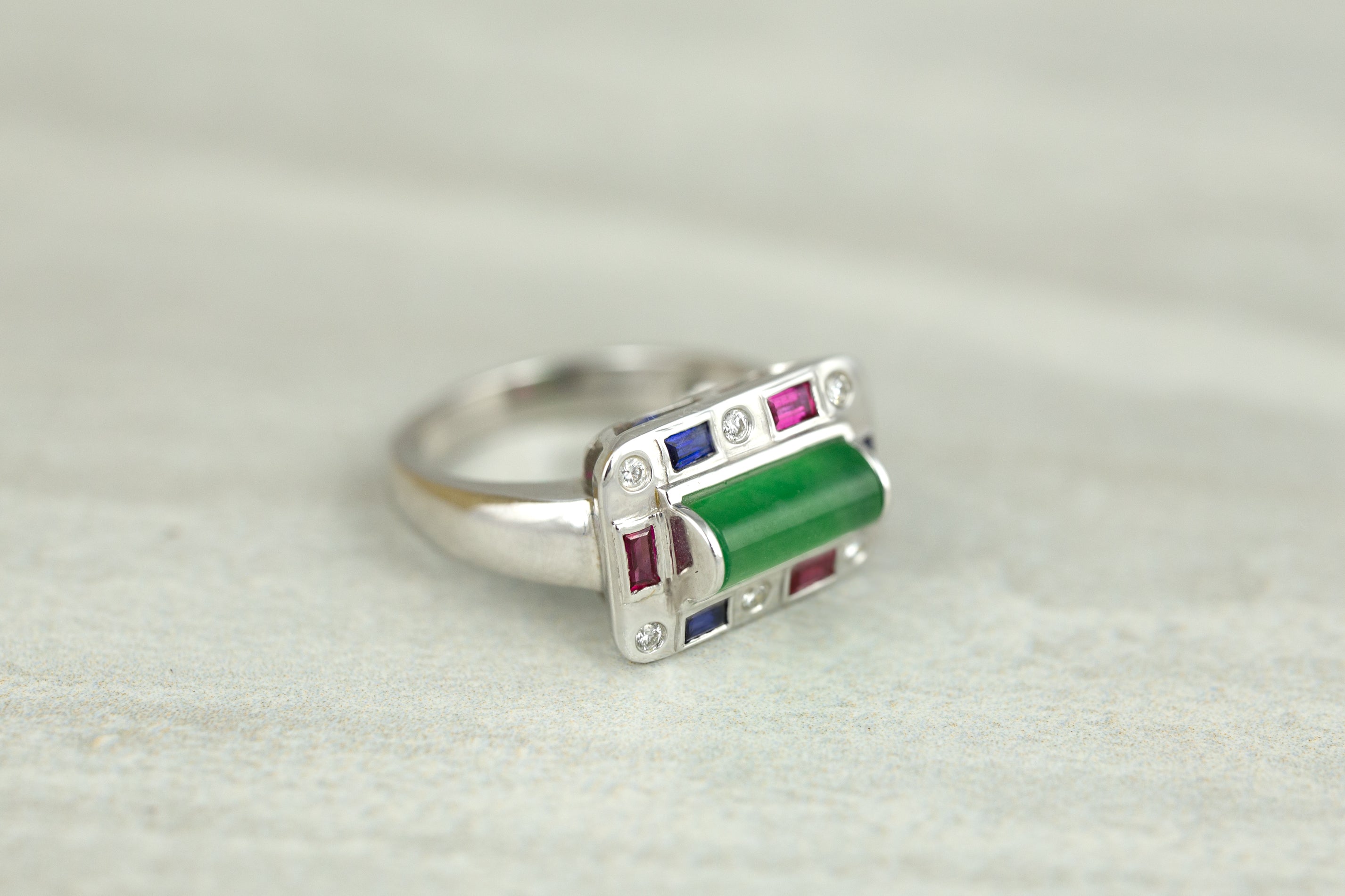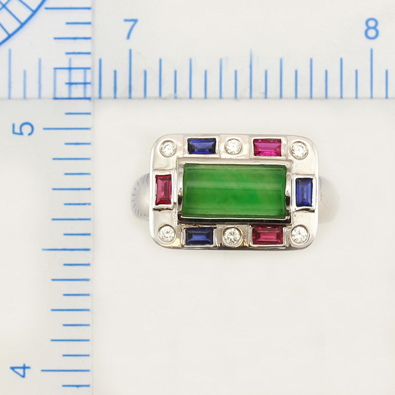 Make a statement with this one-of-a-kind jade ring. Amazing vivid translucent green jadeite half cylinder set in 18K white gold mounting surrounded by rubies, blue sapphires and .09ct round diamonds.