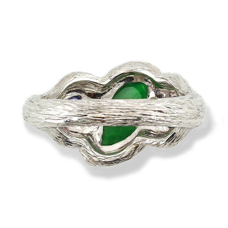 This green jadeite jade ring for women is part of our Mason-Kay Designer Jade Collection. The translucent ridged fine green jadeite jade marquise center is set at a 45 degree angle and accented by two oval cabochon sapphire side stones. Shop natural jade rings from Mason-Kay Jade for your jade jewelry collection.