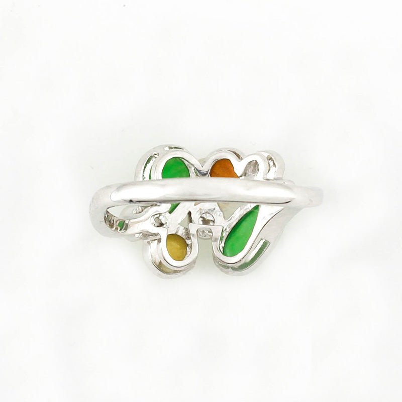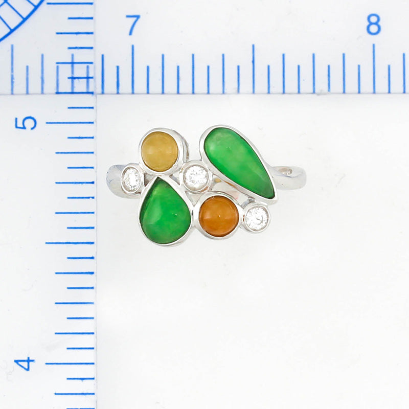 From our Jade Bubble Collection, this designer jade ring features vivid apple green, red, & yellow jade stones with.14cts t/w diamonds set in a 18K white gold. Finger size 7. Only Natural Jadeite. All orders include our Certificate of Authenticity.