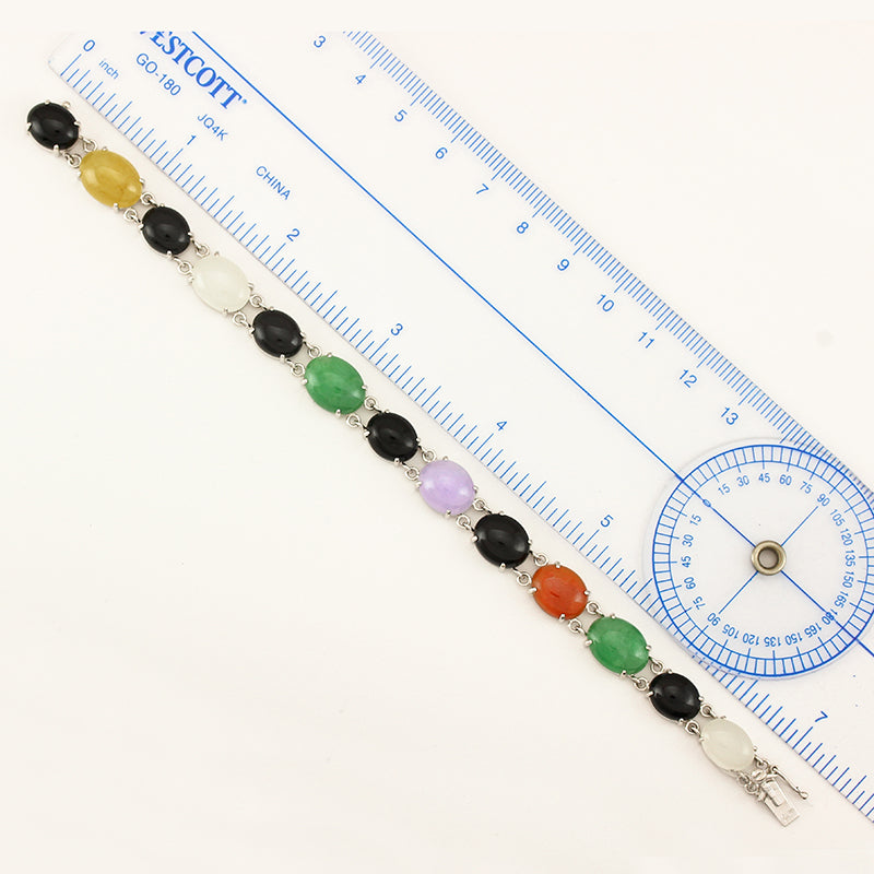 This multi-colored jadeite jade bracelet features thirteen natural jade cabochons in green, lavender, yellow, red, white and black.