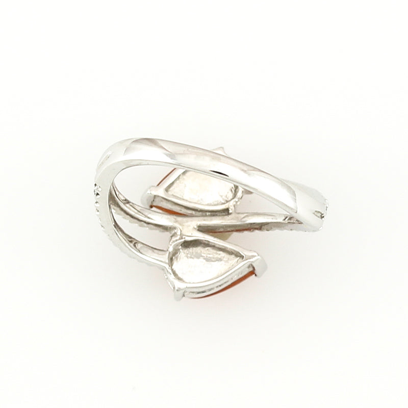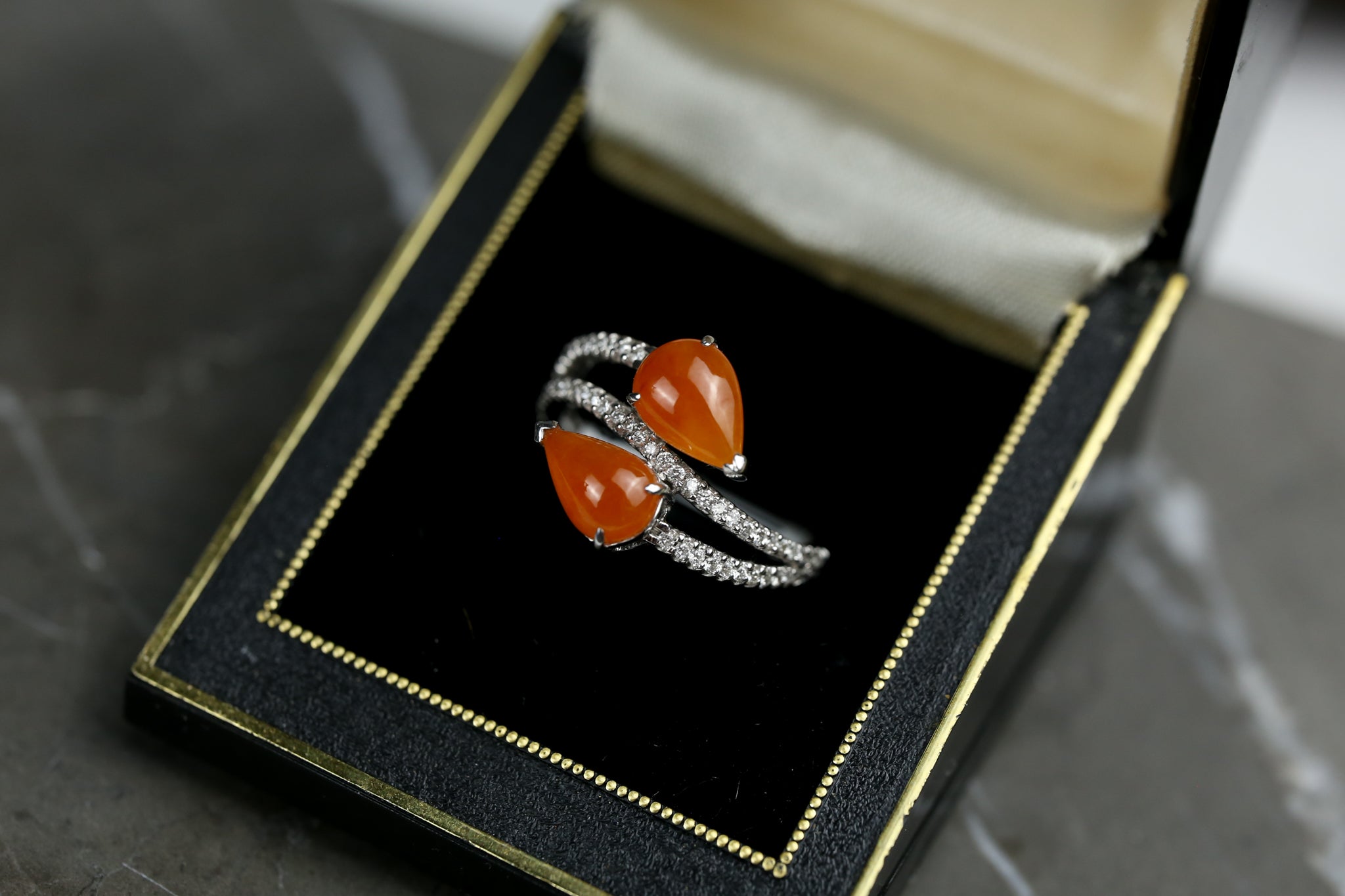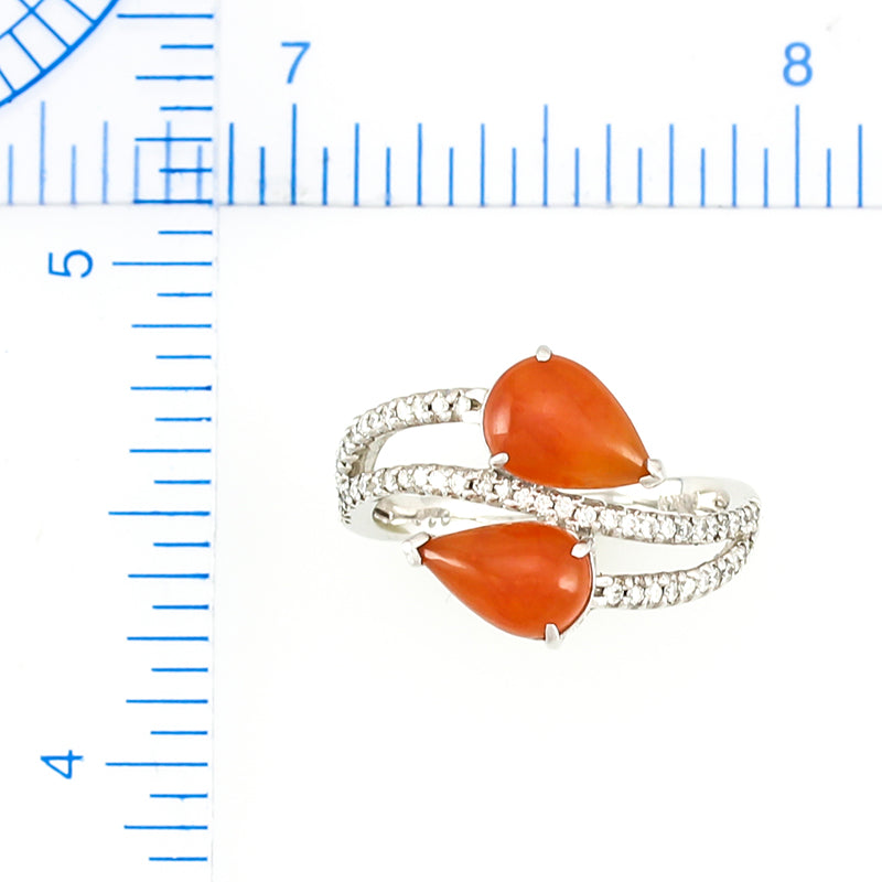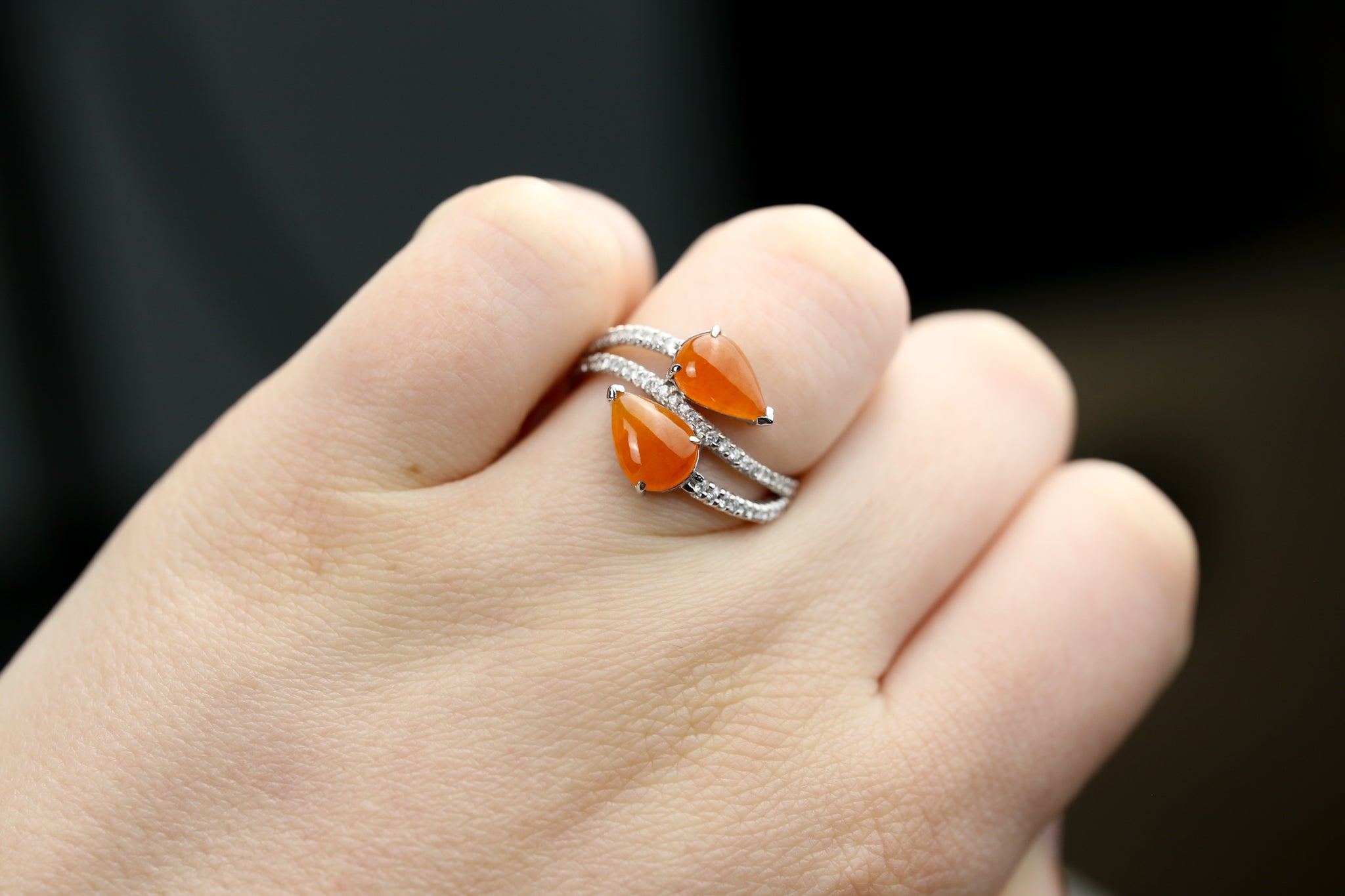This Mason-Kay designer ring features two off-set pear-shaped stones prong set in a pave diamond freeform split shank 18K white gold mounting, size 7. Red is the symbol of good fortune & happiness. Gorgeous Natural Untreated Orange Red Jadeite!
