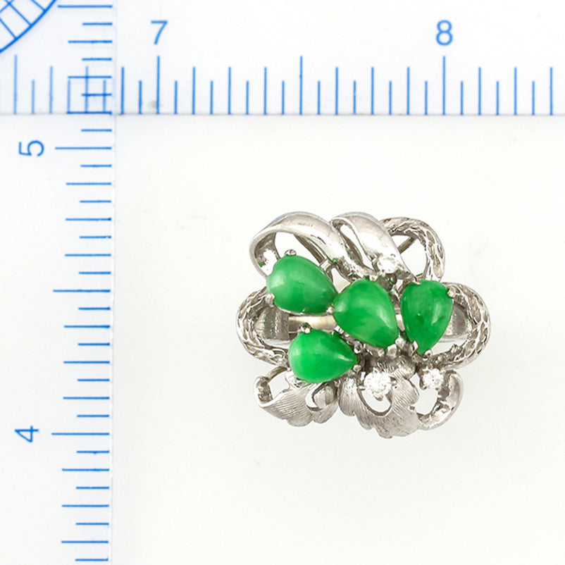 Vintage cocktail ring featuring four pear cut jade stones in 14k white gold with diamonds. Estate jewelry brings history to life, and our natural jade vintage jewelry is no exception. Shop natural jade rings from Mason-Kay Jade for your jade jewelry collection.